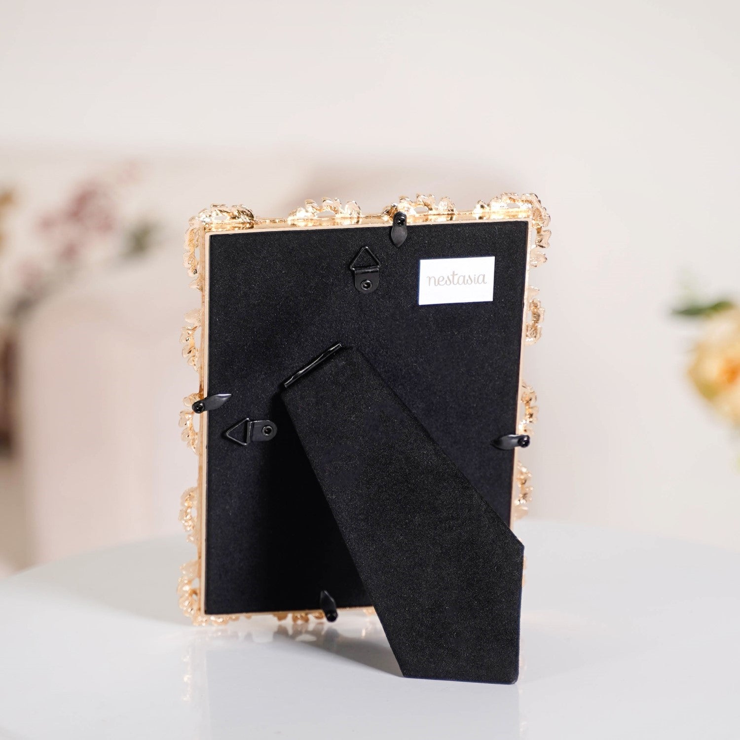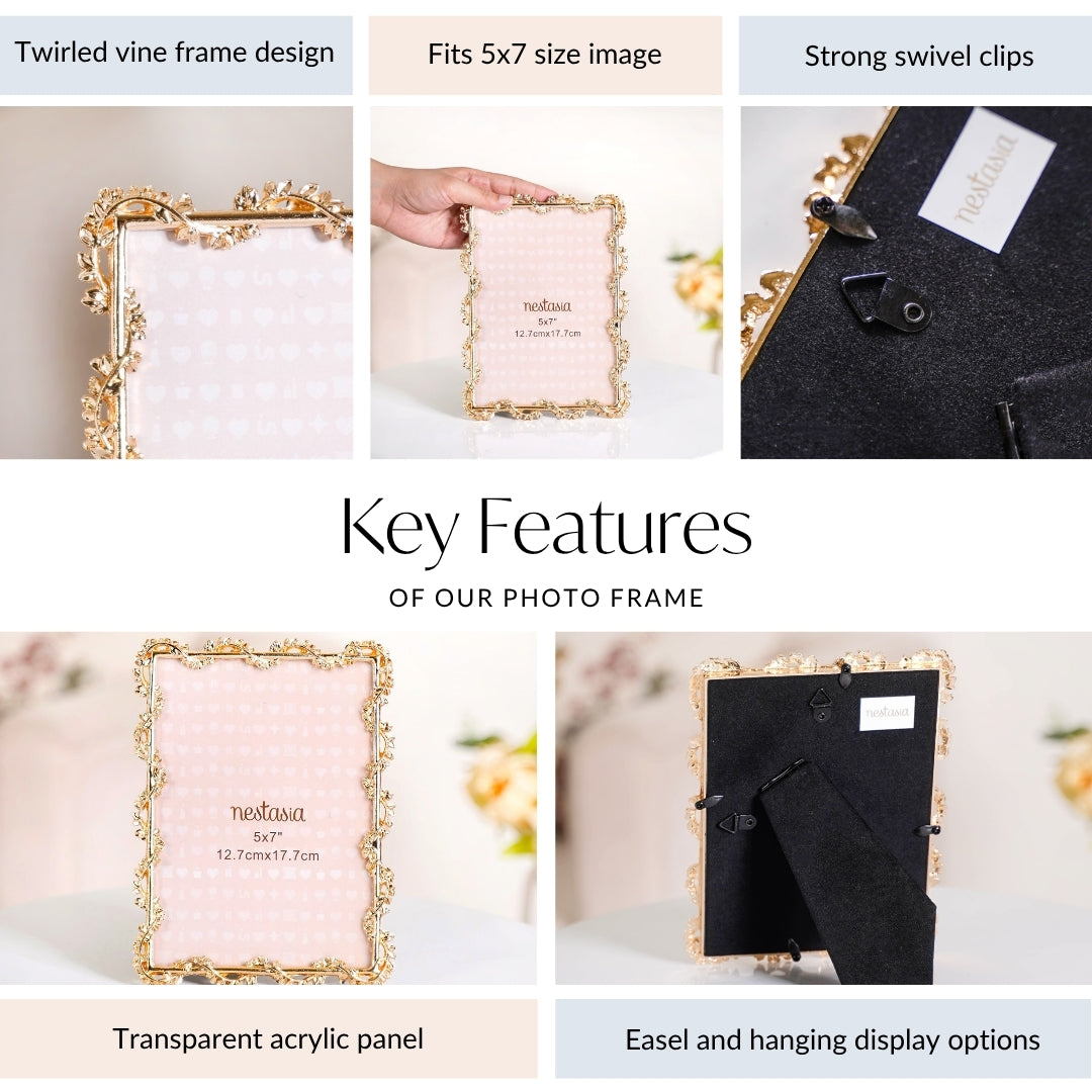 Design: Expertly crafted from sturdy metal and resin, this frame showcases a striking vine-and-leaf pattern that wraps gracefully around its border. The antique gold finish adds a touch of grandeur, while the intricate texture reflects the beauty of nature in every curve. It securely holds a 5x7" image behind a clear acrylic front for lasting protection and clarity. The back is lined with plush velvet and features durable hardware: two rotating hooks for wall hanging and a reinforced easel stand with a satin rope for tabletop display.