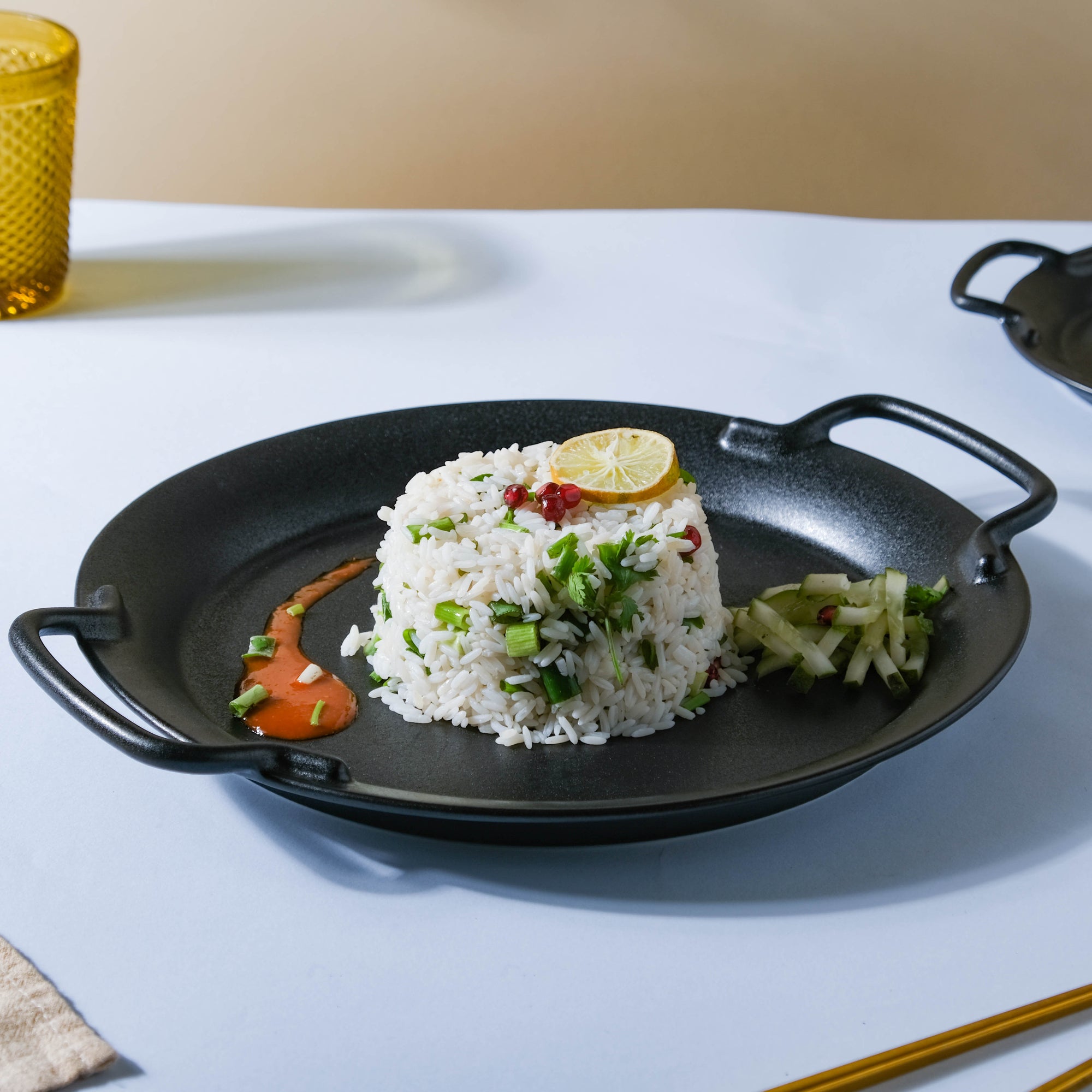 For bigger occasions, the round, black baking dish with handles is an elegant presentation platter that also serves as a baking tray. The baking dish can also be used as a serving plate for a wide variety of appetizers. Biscuits, tarts, nibbles, appetizers, and kebabs can all be baked on the black baking dish. The baking tray can also be used to roast potatoes or chicken. The plates are dishwasher safe, making clean-up a breeze after each use.