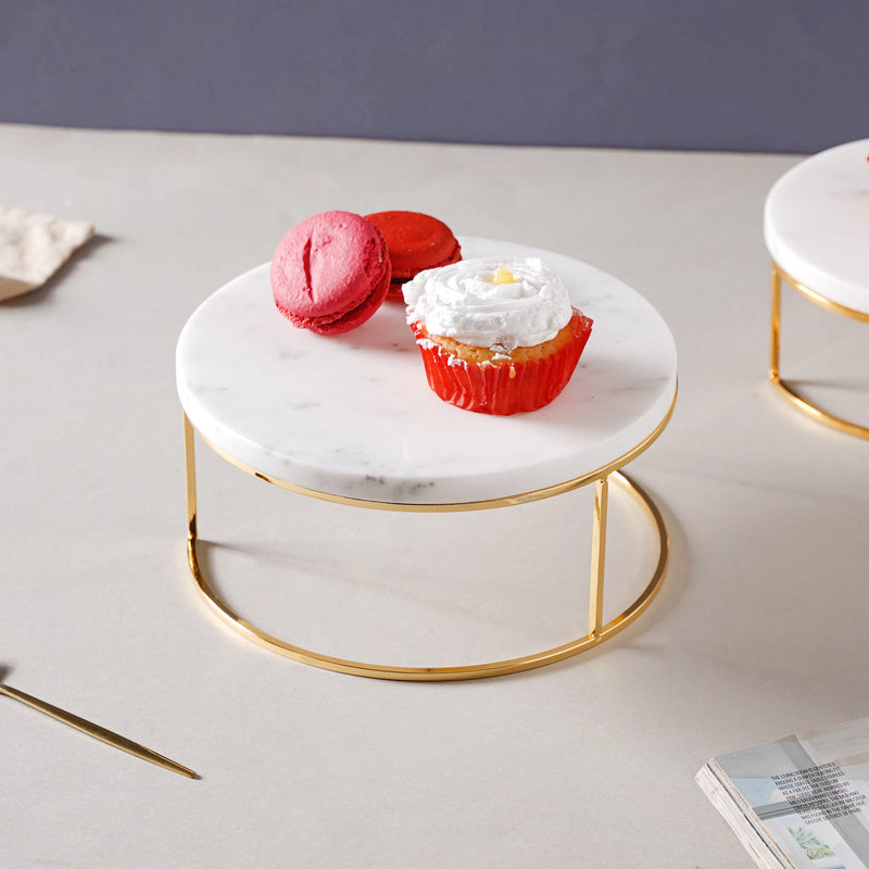 The round marble tray with an elevate stand is perfect as an accent piece. A small bottle of perfume and some minimalistic jewellery can add that extra touch of style and creativity. The gold metal stand makes it a unique buy.