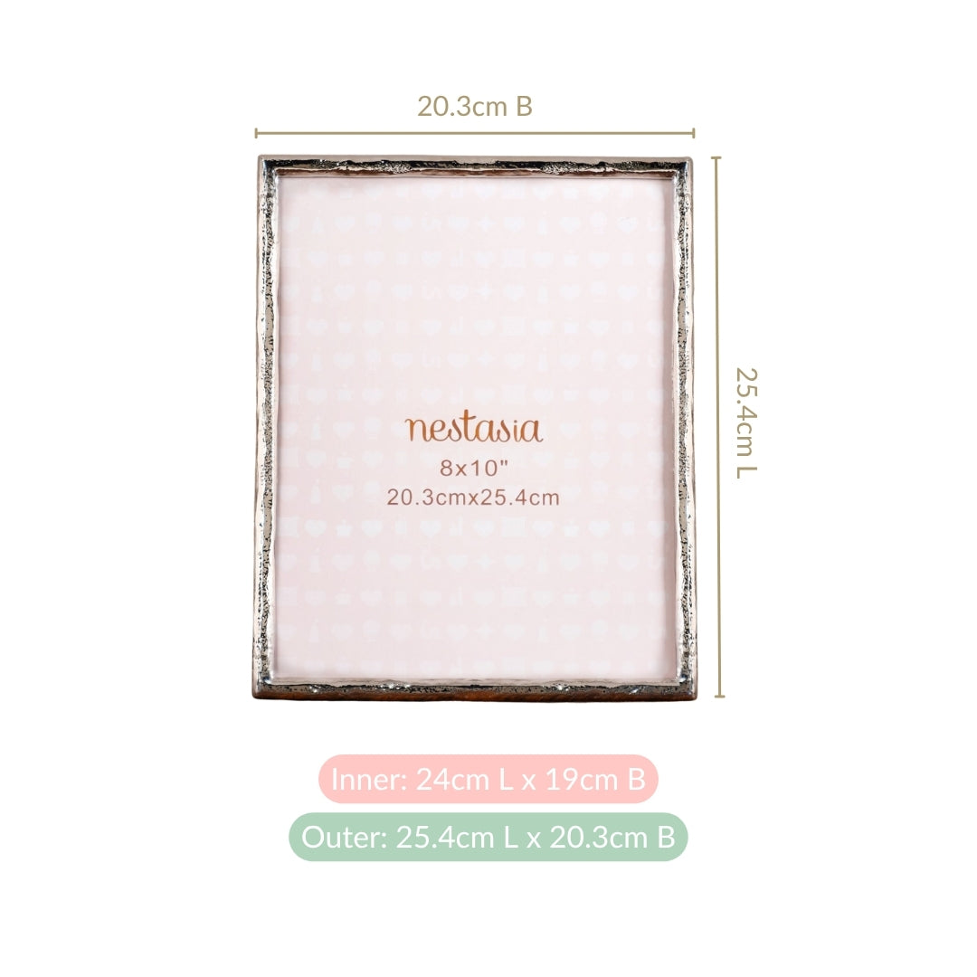 Design: Featuring a hammered metallic border with subtle irregularities that catch the light, this frame exudes sophisticated allure. Textured resin edges mimic hammered metal for an artisanal feel, while the smooth acrylic front ensures crystal-clear photo display and protects images from dust and damage. Finished in polished silver tones, this frame’s meticulous craftsmanship makes it a timeless accent that complements modern, classic, or minimalist interiors. This frame is perfect for displaying 8x10"photos.