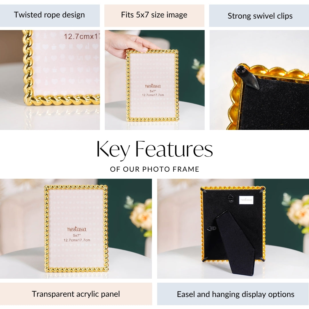 Design: Crafted from high-quality resin, this gold frame boasts an elegant braided pattern that seamlessly intertwines around your photograph, adding depth and character. Its gleaming, high-polish finish enhances both traditional and modern interiors. The frame holds a 5x7 image behind a transparent acrylic cover and features a velvet backing with rotatable hooks for wall hanging and an easel stand for tabletop use.