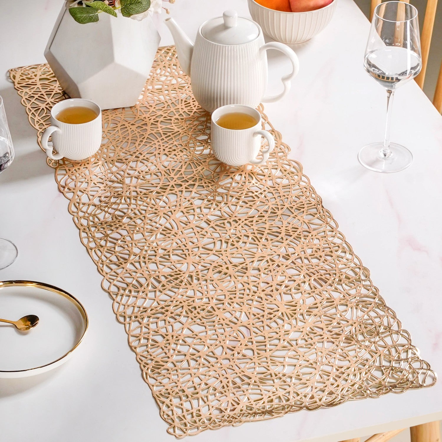 Design: This spectacular dining table runner showcases a mesmerising, openwork design that’s pure artistry in gold. Its intricate pattern forms an organic network of interconnected lines, reminiscent of a beautifully tangled branch system or delicate, abstract lace. The sophisticated golden hue gleams with every shift of light, enhancing the detailed cut-out work. This airy structure allows the underlying table surface or tablecloth to peek through, creating a dynamic visual interplay.