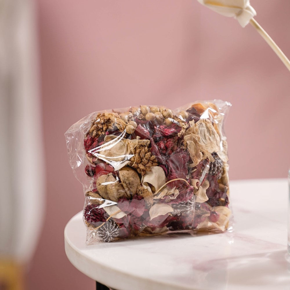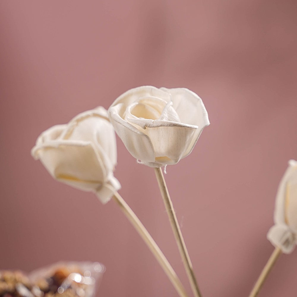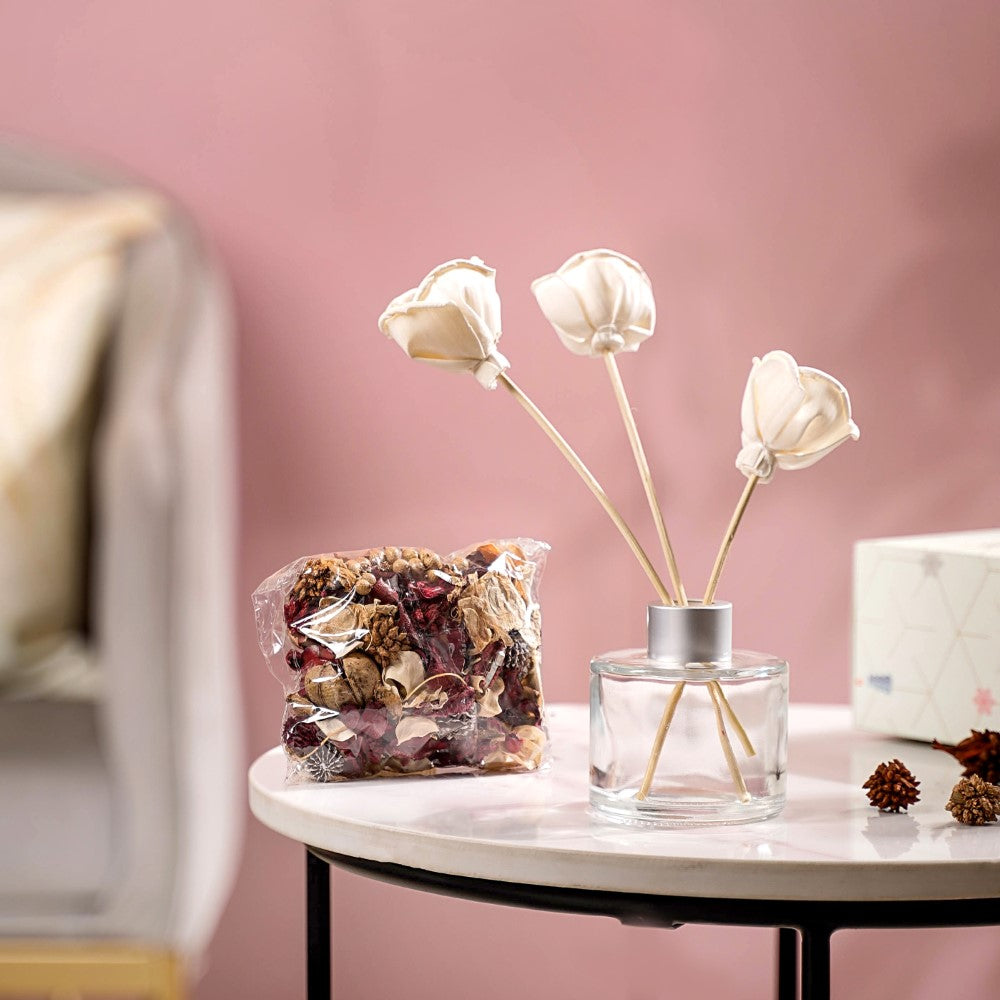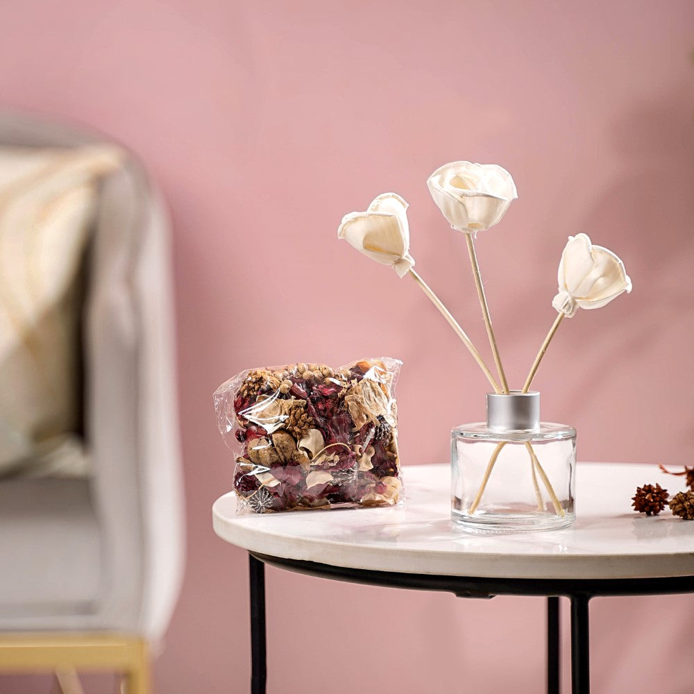 Create a serene and refreshing atmosphere in your home with our sophisticated lavender fragrance reed diffuser. The floral and herbaceous scent of this fragrance uplifts your senses and helps you release your stressors, promoting a feeling of contentment and relaxation. The diffuser comes with a sleek glass container filled with a lavender-scented oil and a set of 3 reed sticks adorned with handcrafted sola roses. The reeds are designed to absorb the oil and diffuse the fragrance throughout the room, creating a pleasant aroma. Lavender is known for its calming and soothing properties, making this diffuser perfect for enhancing the ambiance of any room where the reed diffuser might be placed. In addition to its therapeutic benefits, the diffuser also serves as a decorative item that complements any home decor. The set also includes a pack of natural floral potpourri that can be infused with the given aromatic diffuser oil.