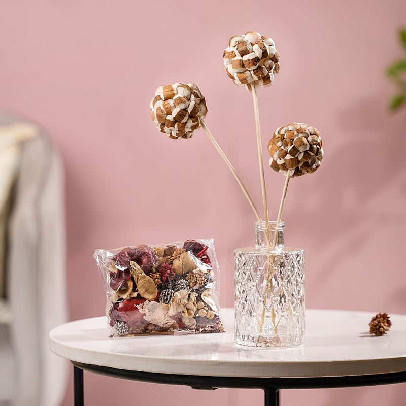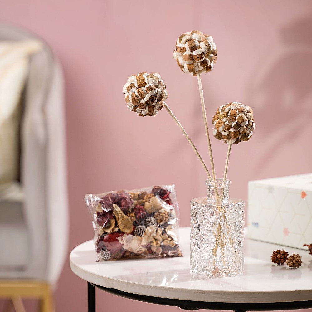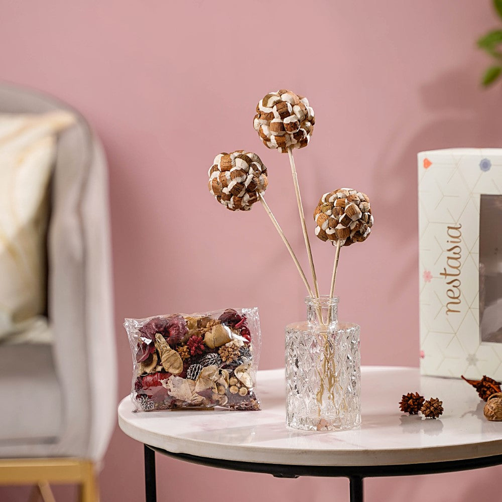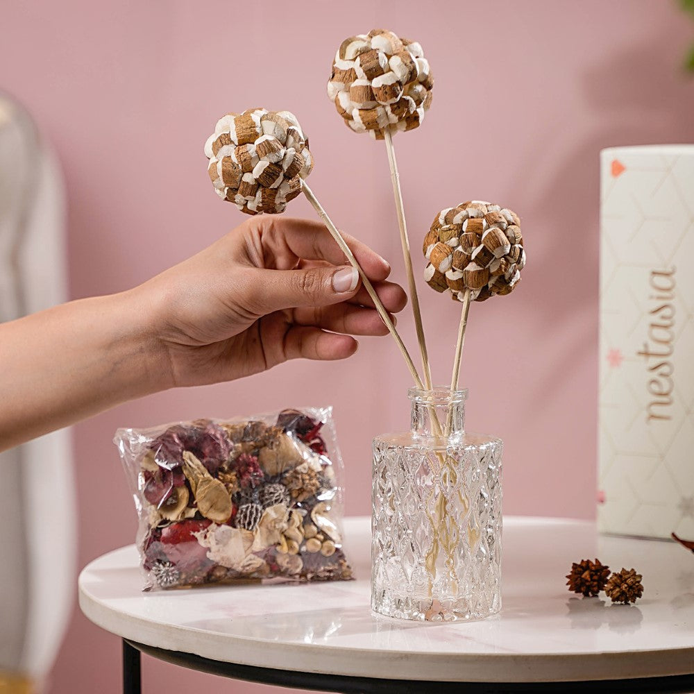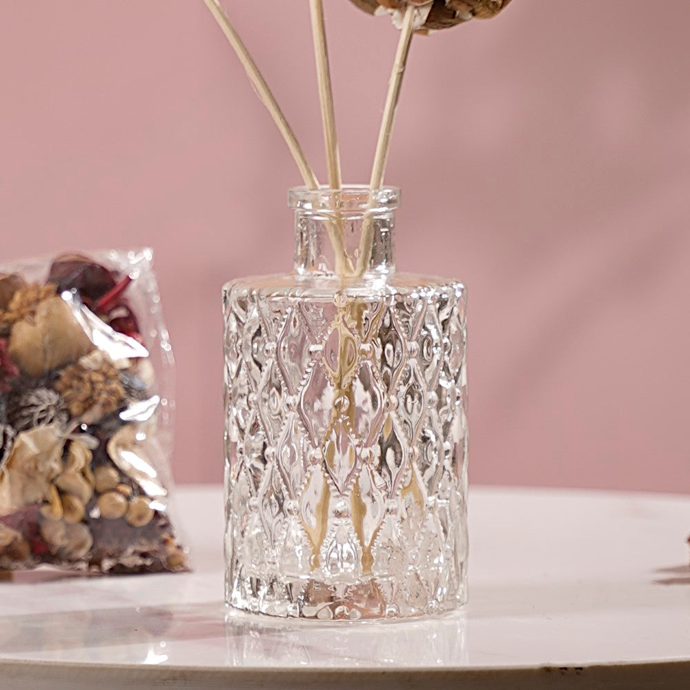 The diffuser set has been curated and crafted with the goal of inspiring peace. The set includes a cut-glass diamond textured bottle filled with lavender-scented diffuser oil and 3 sola flower reed sticks. The oil is made from natural ingredients, and the lavender scent is known for its calming and relaxing properties. The reed sticks are porous and allow the oil to flow up and diffuse the scent into the air. The dried flower reed sticks also add a touch of natural beauty to the set. In addition to the bottle and reed sticks, the set includes a packet of potpourri which is a mixture of dried flowers, herbs, and spices that can be infused with the given diffuser oil. The potpourri can be placed in a dish or bowl and can be refreshed with a few drops of the lavender oil.