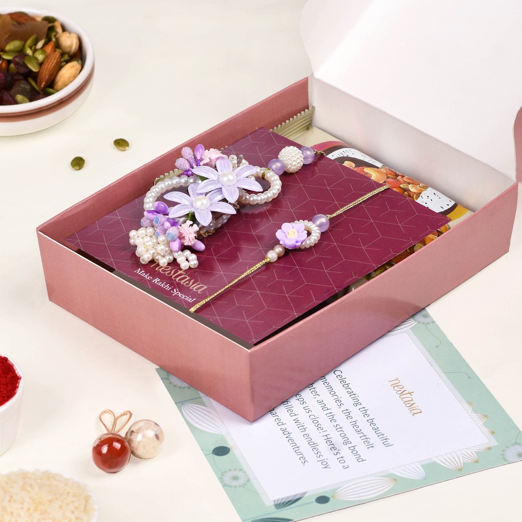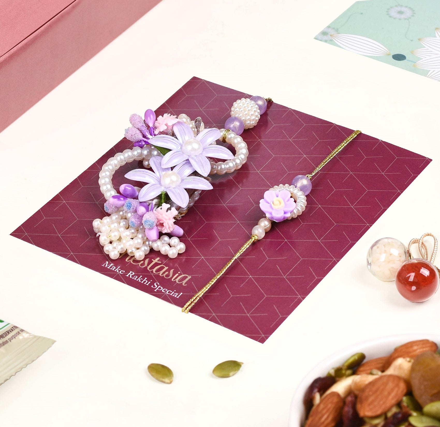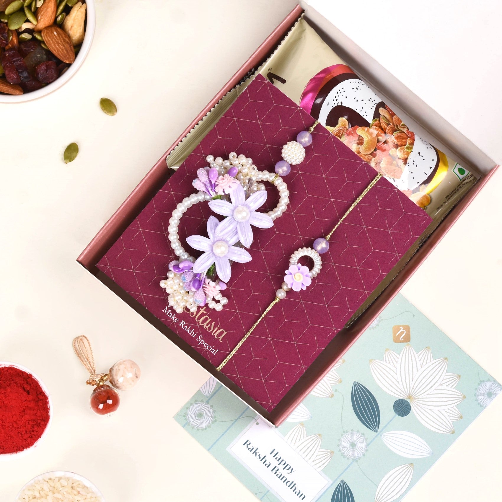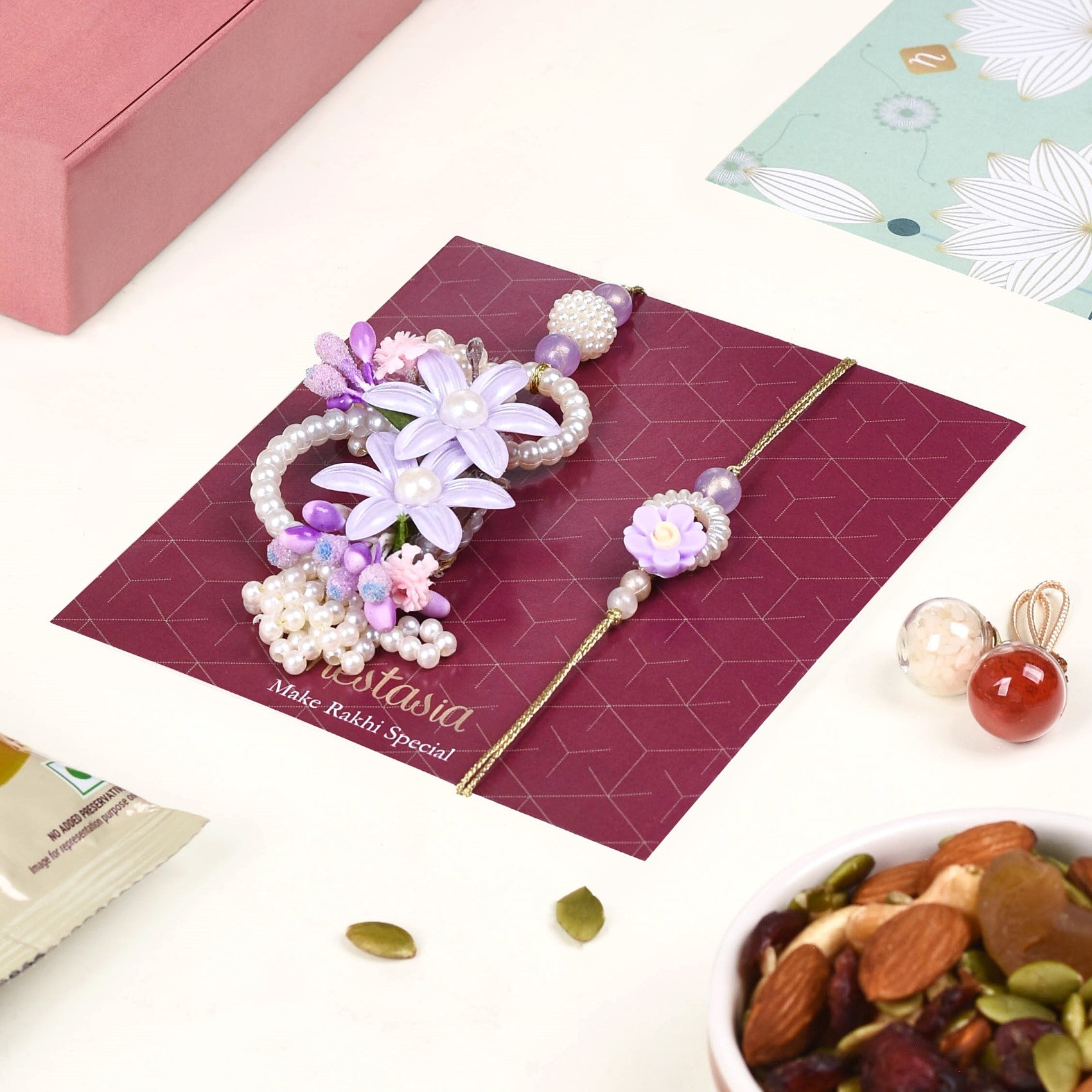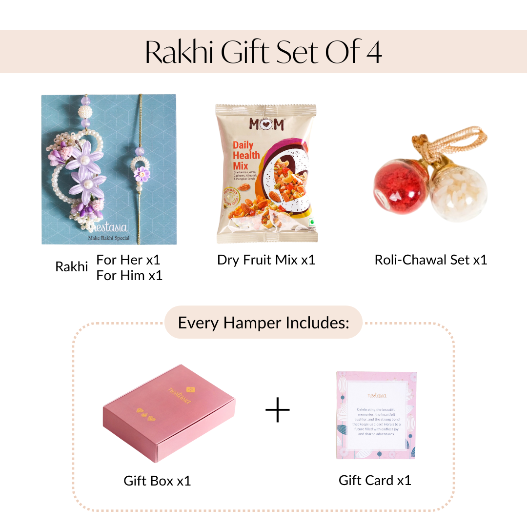 Brimming with many delightful surprises, the gift box features a simple yet elegant Rakhi bearing a glimmery translucent mauve bead, a cream-hued flower charm that's hollow in the middle, a dainty lavender flower charm resting atop, and artificial pearls. Accompanied by a lumba adorned with clusters and rings of faux pearls, two lavender flower charms with intricate details, and buds and blooms on the side, this gift set is perfect for both your sister and sisters-in-law. Complete with a roli-chawal set, a pack of decadent mixed dry fruits, and a beautiful wish card, this special gift box is the ultimate way to make Rakhi memorable and eventful.