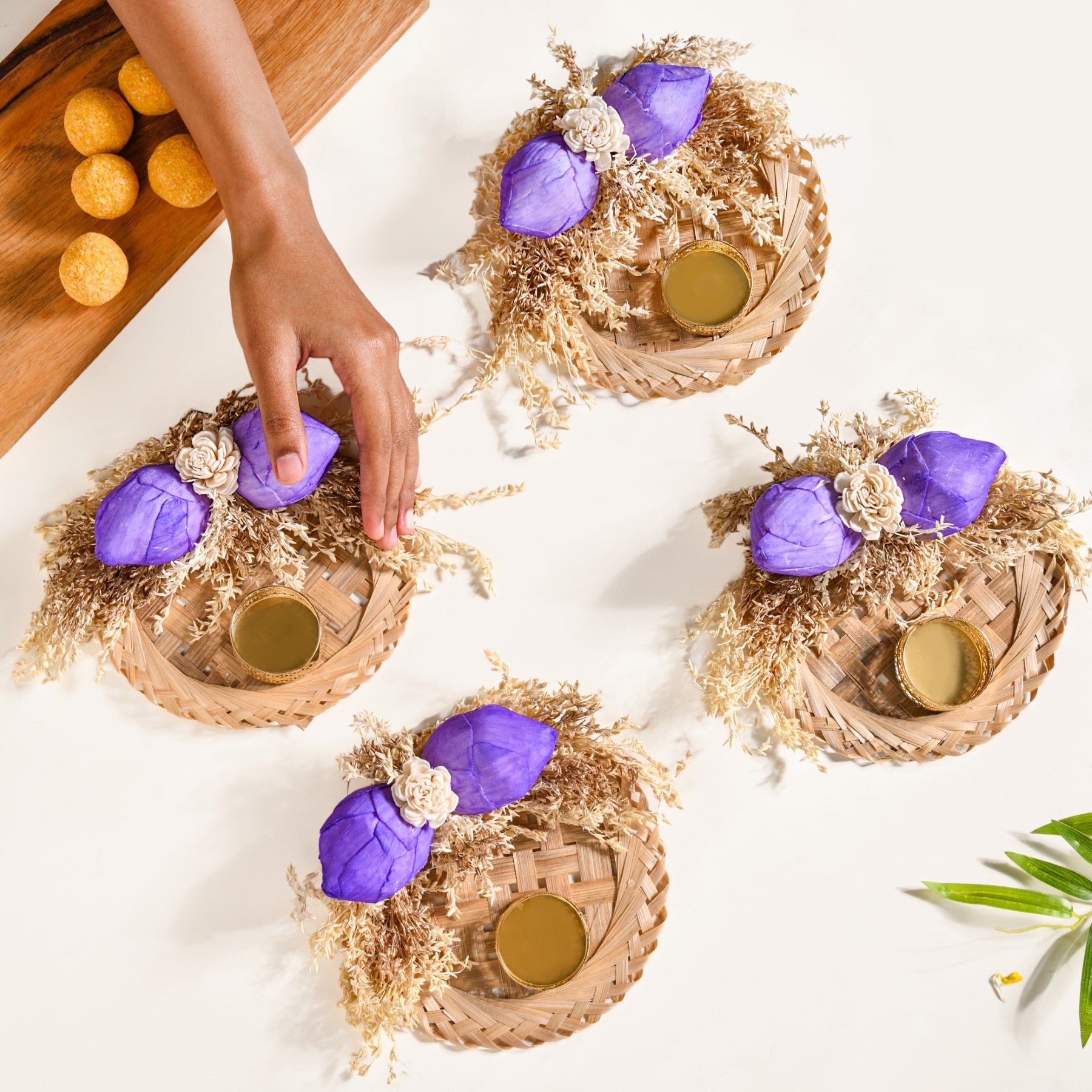 Benefit: This set is reusable, biodegradable, and easy to maintain - perfect for eco-conscious celebrations. The lightweight build makes it easy to move and style, while the golden insert ensures your candles stay safe and stable. Whether you use real tea lights or LED versions, the holders bring a warm, calming ambience. Ideal for poojas, dinner parties, and gifting, these dried flower accents help create thoughtful decor that celebrates both tradition and nature.