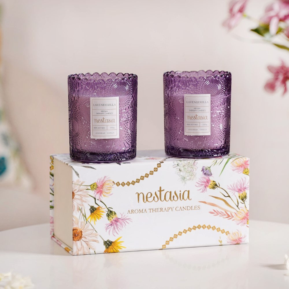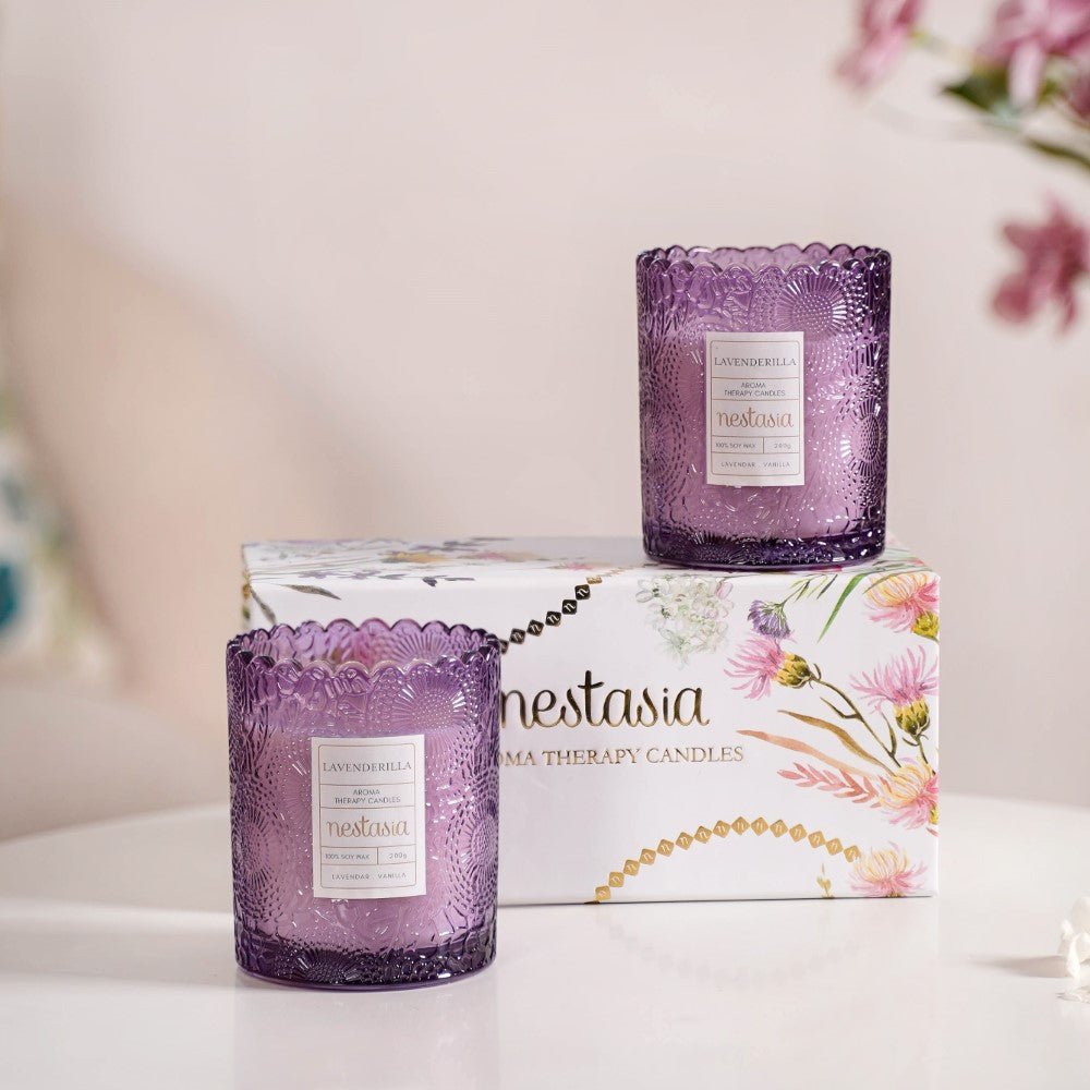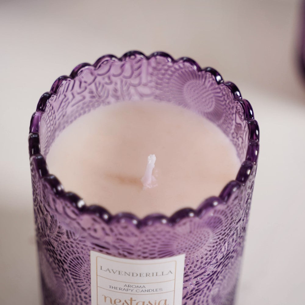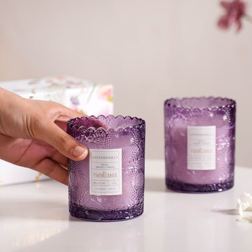 Take a deep breath and unwind with the exquisite Lavenderilla scented candle votive. Your home will exude a tranquil atmosphere with the soft fragrant tones of lavender and vanilla. The sweet and flowery scented candle is hand-poured into a glass jar that features intricate cut-glass textures and soothing purple colour. The votive candle exudes a warm glow with a fragrance that dissipates easily into the surrounding.