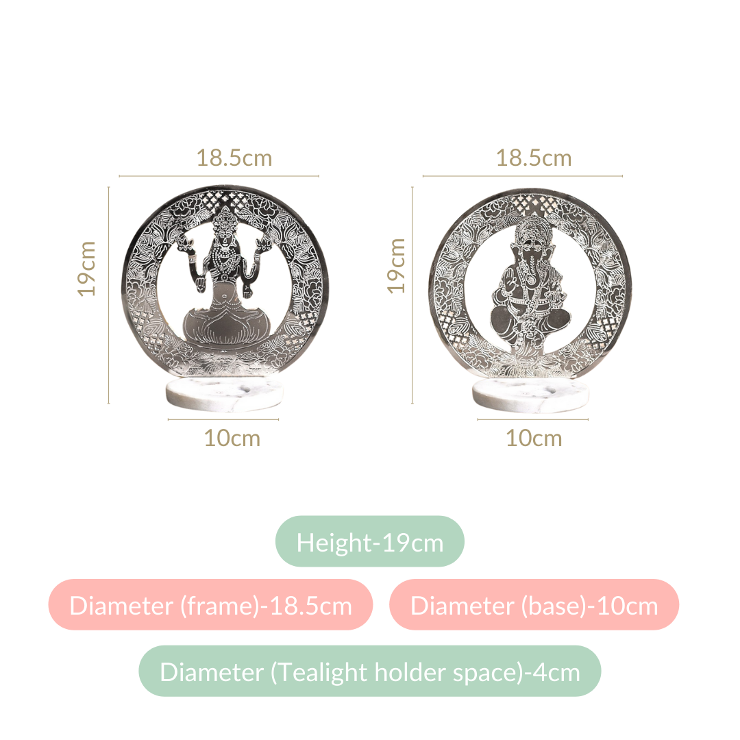Design: The set includes two beautifully crafted tealight holders, each with a circular brass frame adorned with metal cutwork designs of Ganesh and Laxmi. One holder showcases the Ganesh motif, while the other features Laxmi, adding a spiritual touch to your space.