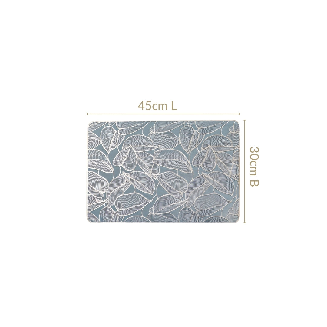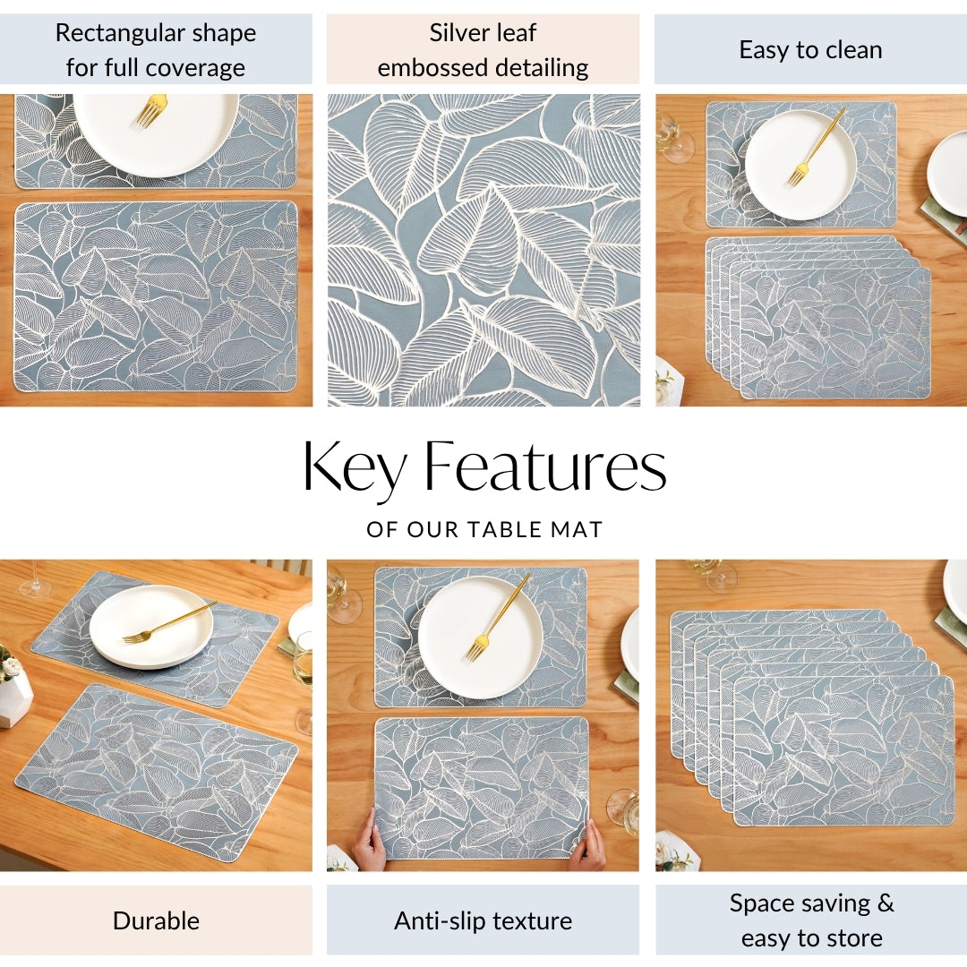 Design: These rectangular table mats are designed to create a crisp and clean dining layout. Crafted in durable white PVC, each mat features a silver leaf embossing that brings subtle shimmer. The leaf motif is textured with intricate detailing for a tactile finish. The surface is lightly raised, offering grip and depth. Soft, round edges frame each placemat with a smooth, polished contour. Together, these elements make the mats both functional and visually striking.