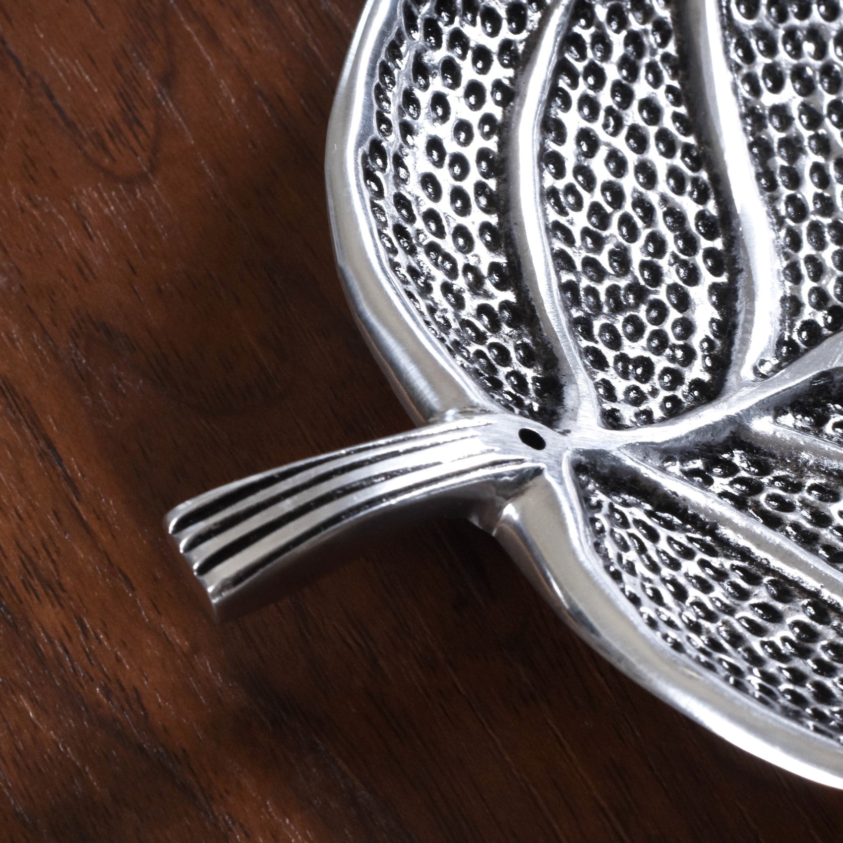 Transform your sacred space into a sanctuary of serenity with our distinguished ash catcher, made from premium-quality aluminium. Embrace nature's grace with its peepal leaf shape, meticulously detailed to evoke the tranquillity of a forest glade. Adorned with a delicately textured design, this metal stand exudes timeless elegance and traditional charm, perfect for enhancing your spiritual rituals or daily meditation practice. Finished with an antique patina that lends an air of vintage sophistication, its rust-resistant and durable construction ensures longevity and resilience against the passage of time. Elevate your ambience and ignite your senses with our exquisite incense holder, a testament to the beauty of mindful living. The incense holder comes with a box of lavender-scented organic incense sticks.