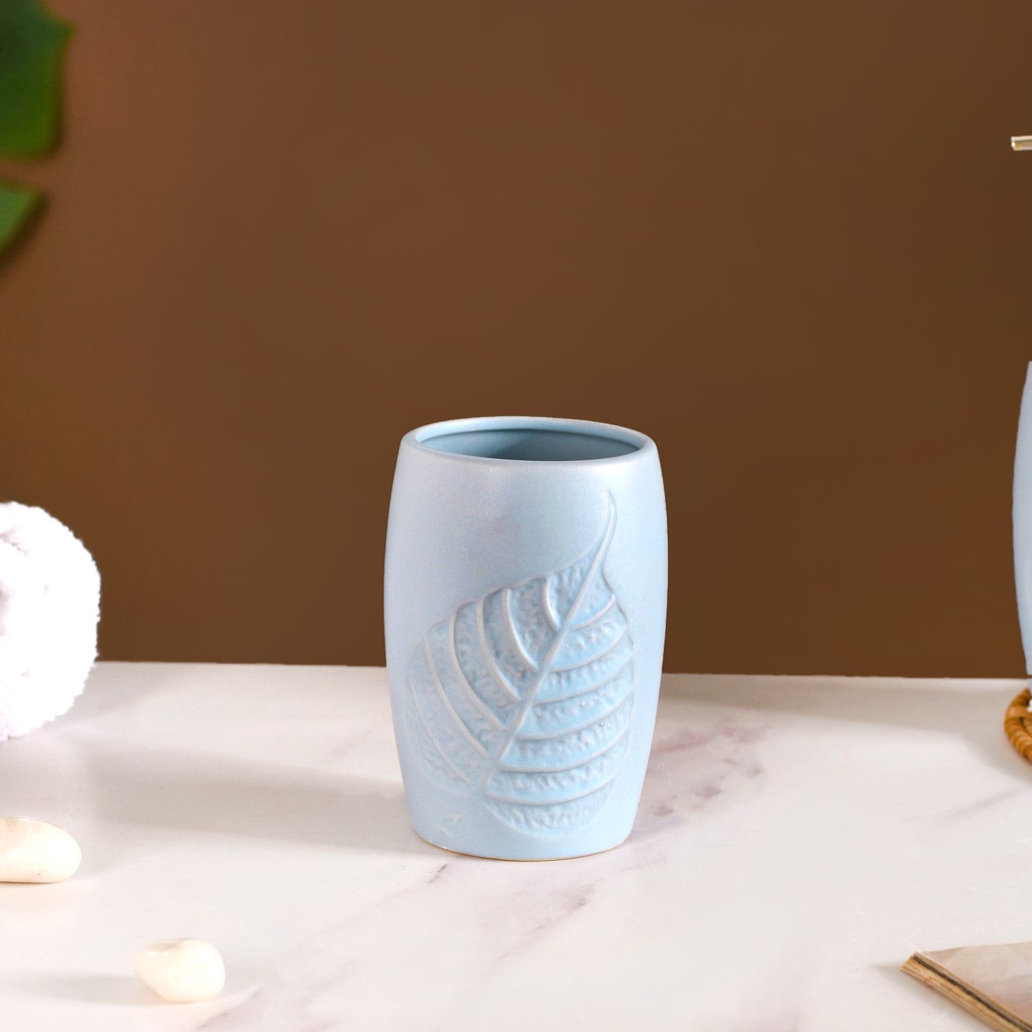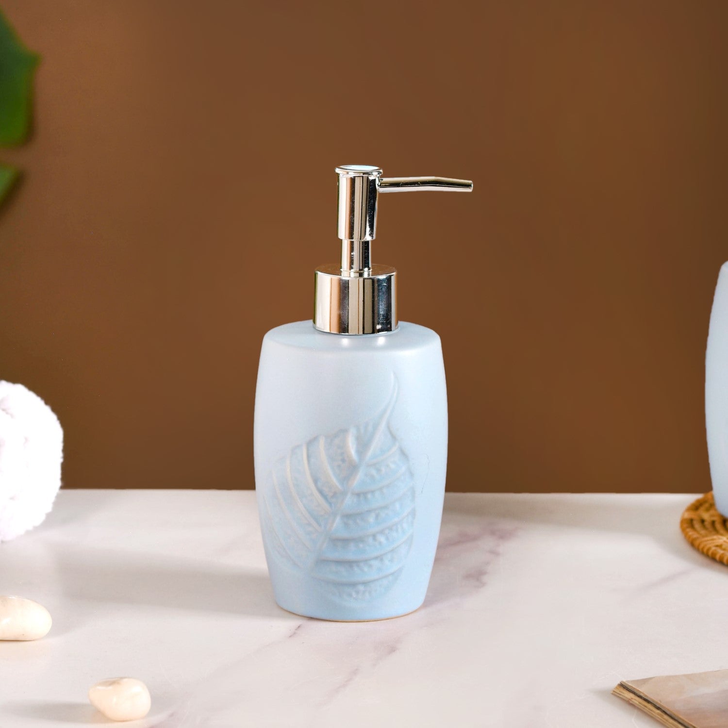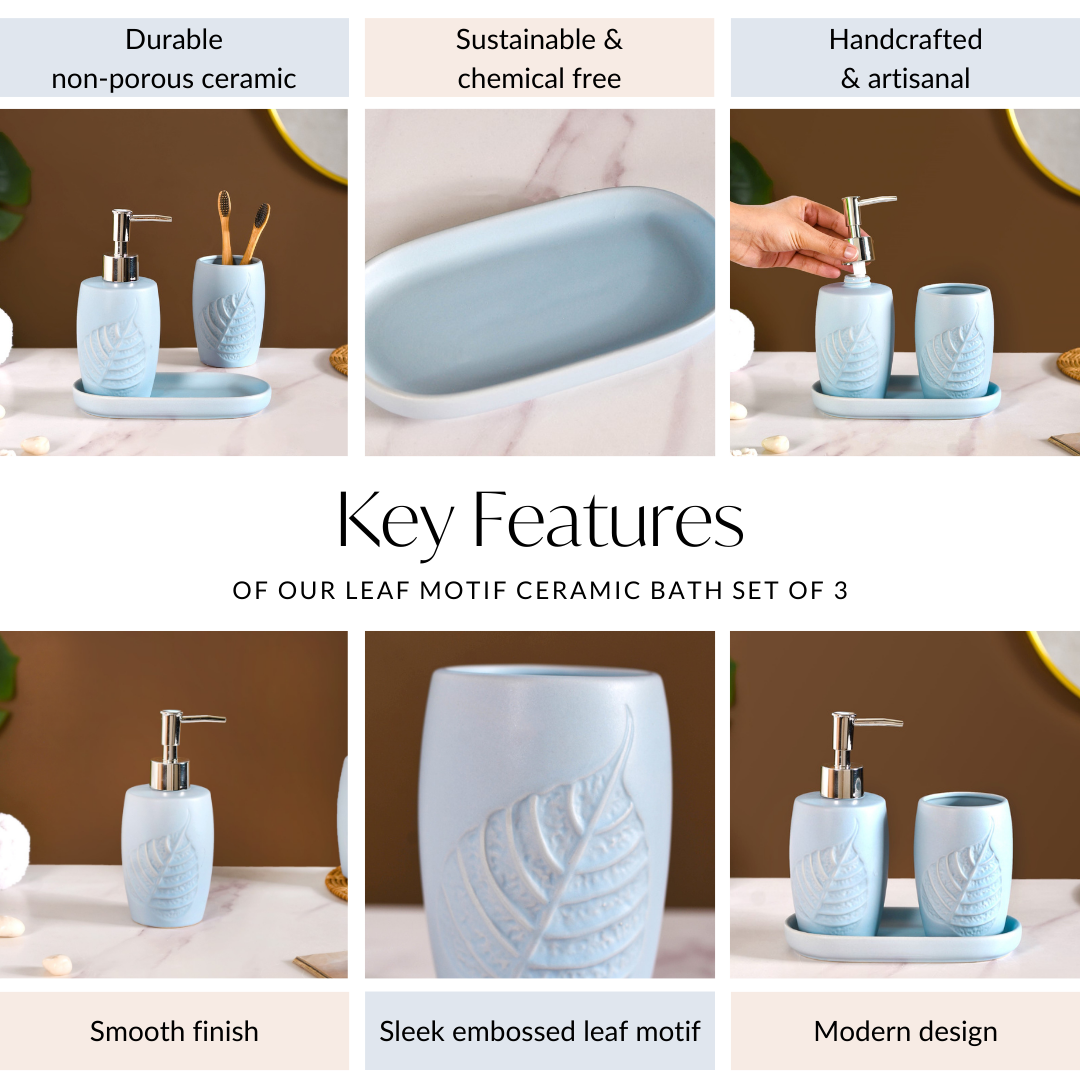 The compact bath set with tray is an elegant set made of ceramic. It's time to turn your bathroom into your own personal spa-radise with this drop-dead gorgeous bath set, the ultimate combination of style and functionality. Formed using high-quality, non-porous ceramic, this bath set is not only extremely durable, but also an eco-conscious choice, thus highlighting our commitment to providing quality, sustainable products to homes. The bath set comprises a refillable soap dispenser that has a pumpable nozzle, allowing you to easily dispense soap in a controlled and hygienic manner, along with a chic tumbler to hold your toothbrushes or bathroom essentials alike. The bath set is completed with a long tray, allowing you to place the soap dispenser and tumbler on top for a clean and organised look. Now on to the main event that we're all here for. We're talking about the captivating design! The serenity of the sky blue hue paired with the enchanting leaf motif transports you to a tranquil oasis, where every moment feels like a rejuvenating escape. Transform your daily routine into a luxurious experience with this beaut of a bath set, where every detail speaks volumes about your impeccable taste.