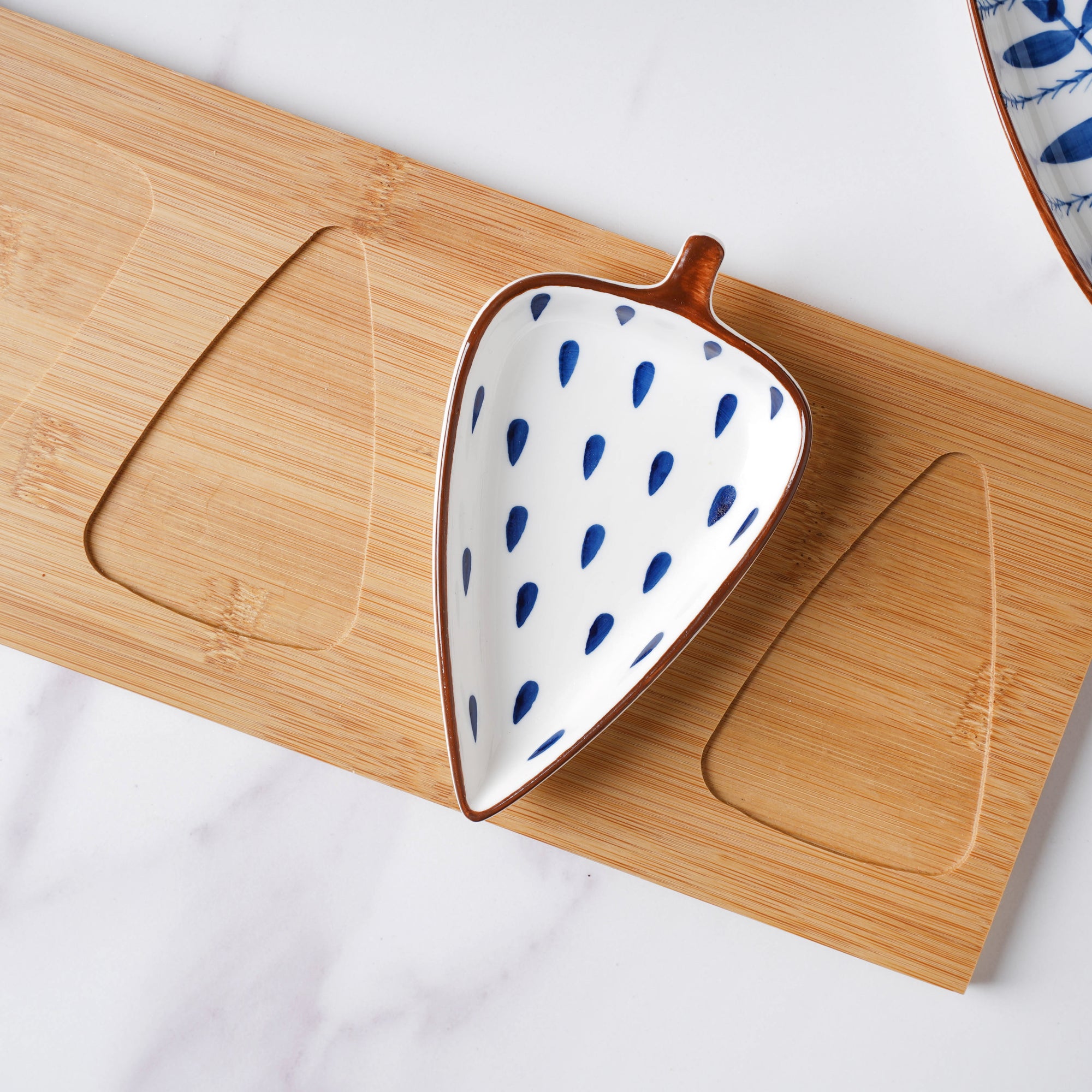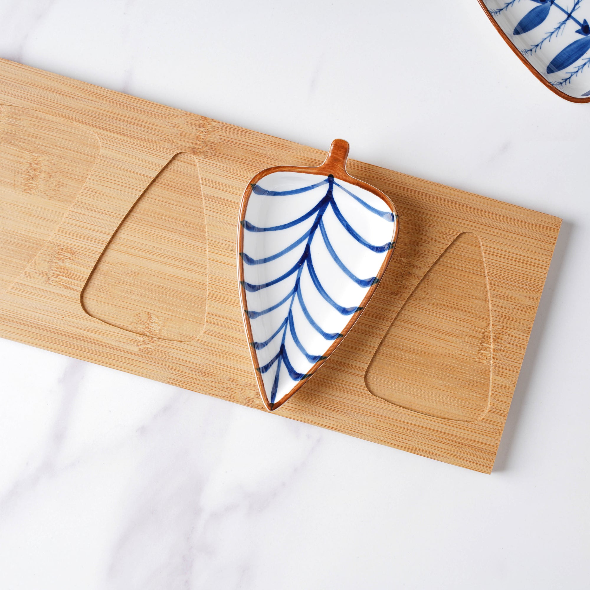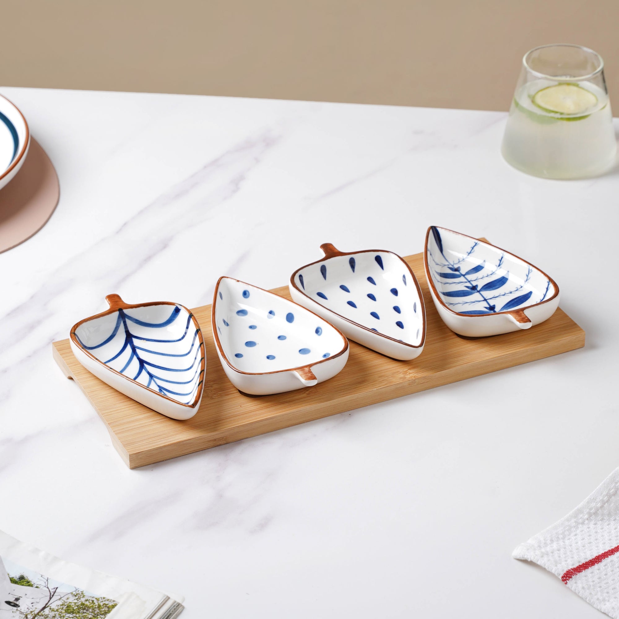 Uplift the modern tablescape with a set of 4 hand painted Japanese platters which will usher in a dash of elegance and grace to the dinner set-up. The serving platter set comes with a wooden tray and four small plates in the shape of a leaf. Each serving plate has a distinctive abstract pattern and can be used for serving a variety of dishes on any occasion. The durable ceramic plates are kept in an alternate direction, thus enhancing their appeal and adding quirk to the platter.