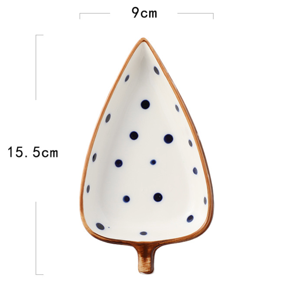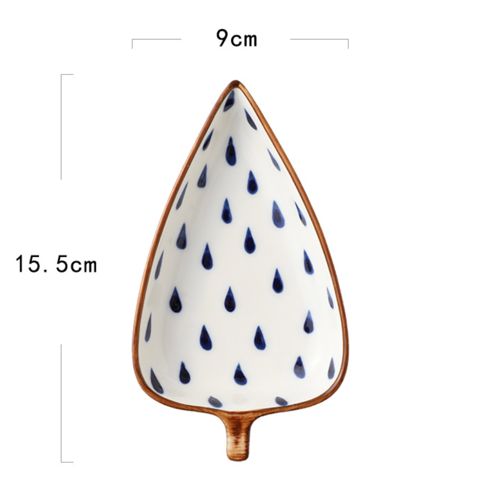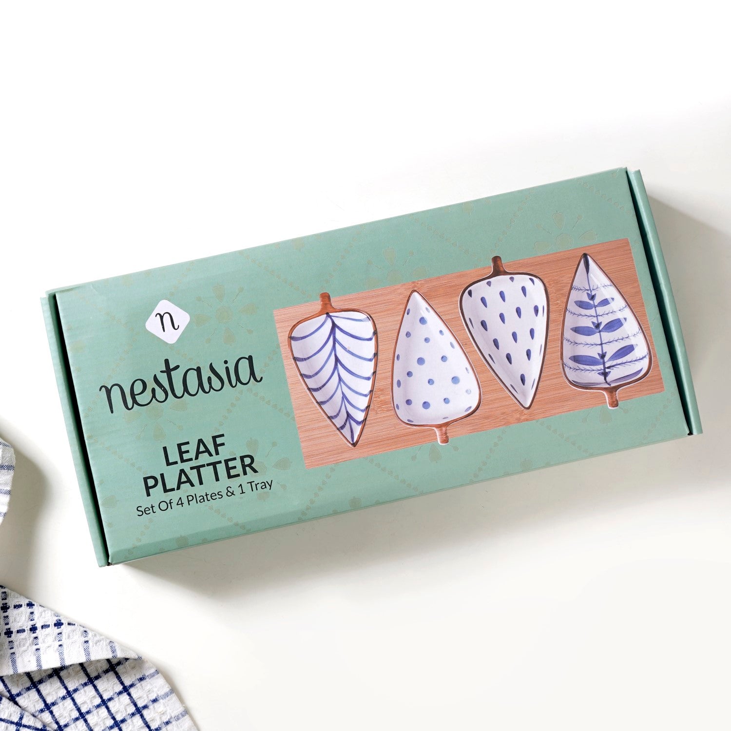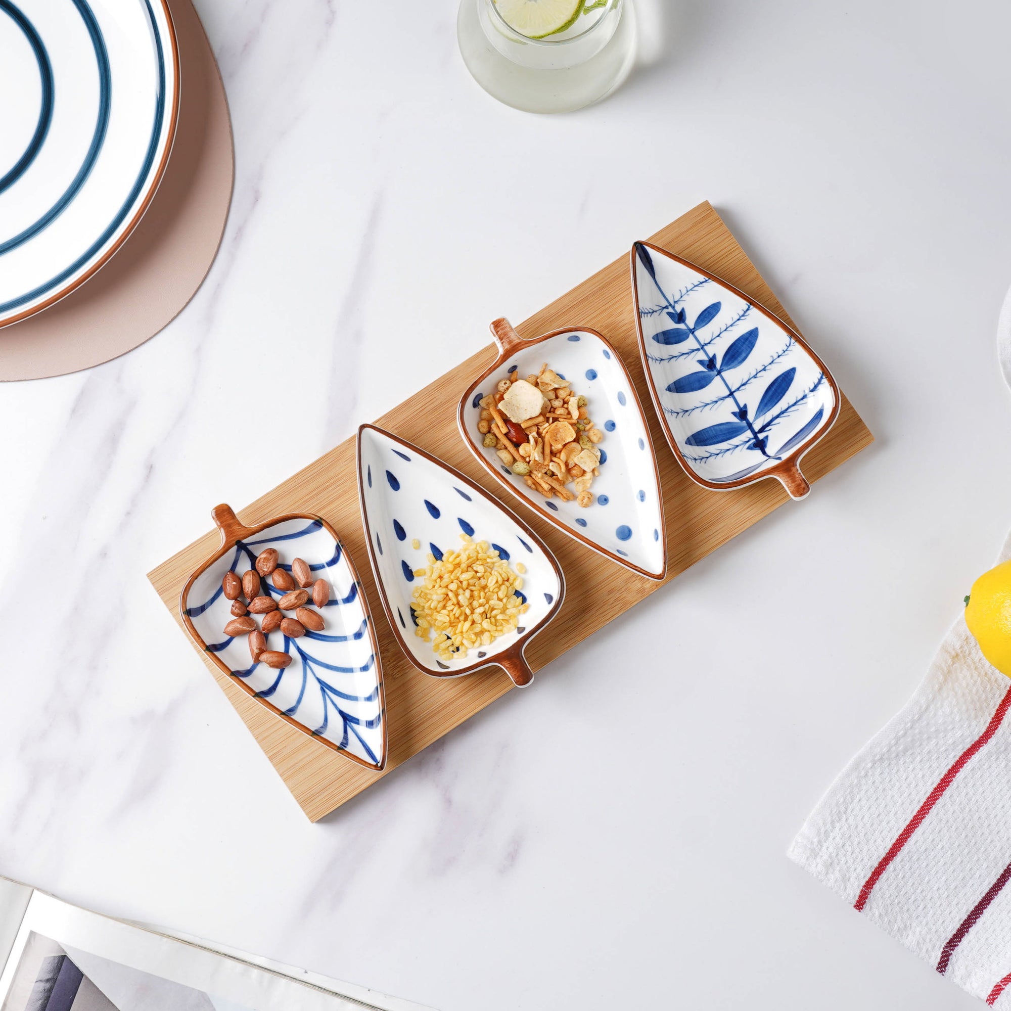 Uplift the modern tablescape with a set of 4 hand painted Japanese platters which will usher in a dash of elegance and grace to the dinner set-up. The serving platter set comes with a wooden tray and four small plates in the shape of a leaf. Each serving plate has a distinctive abstract pattern and can be used for serving a variety of dishes on any occasion. The durable ceramic plates are kept in an alternate direction, thus enhancing their appeal and adding quirk to the platter.