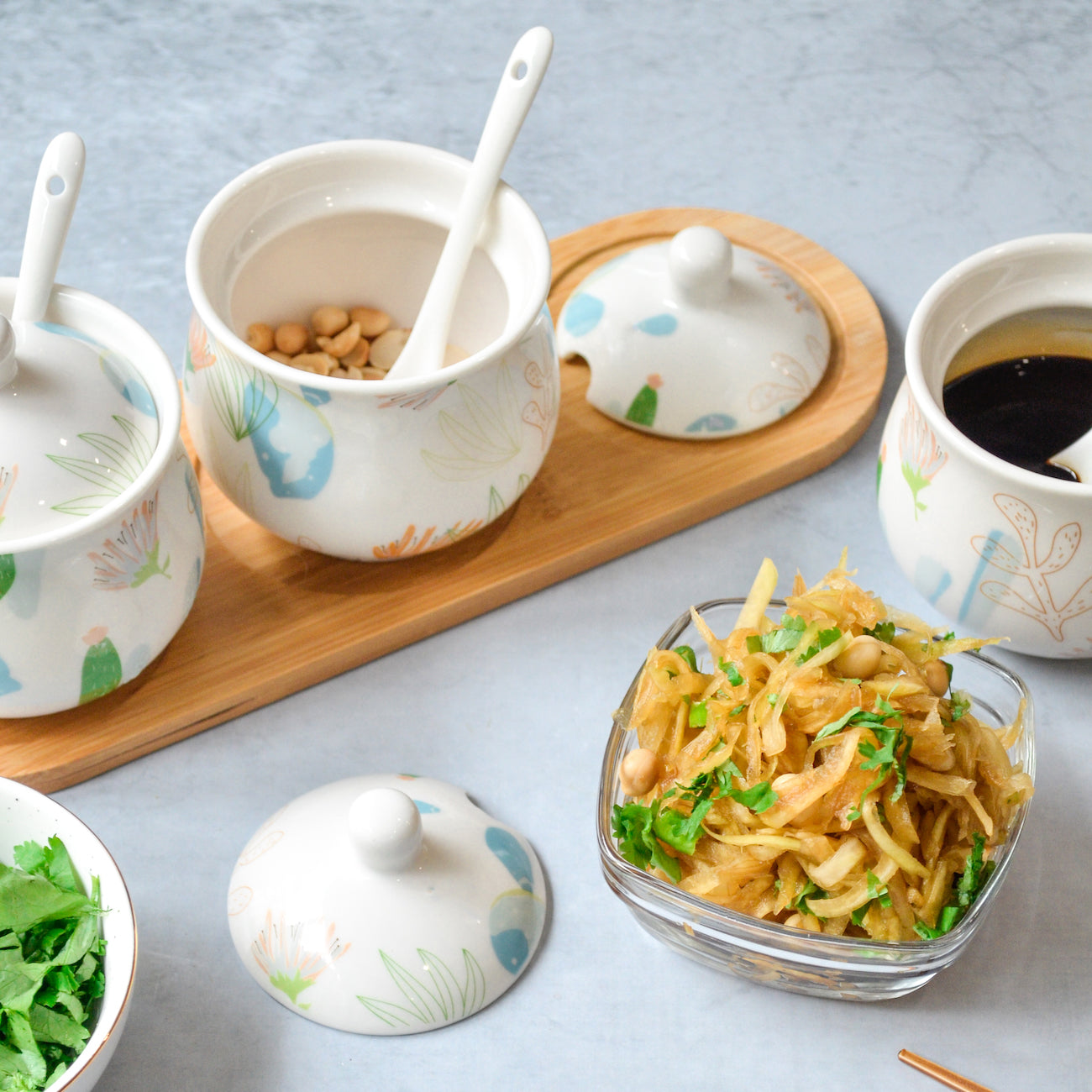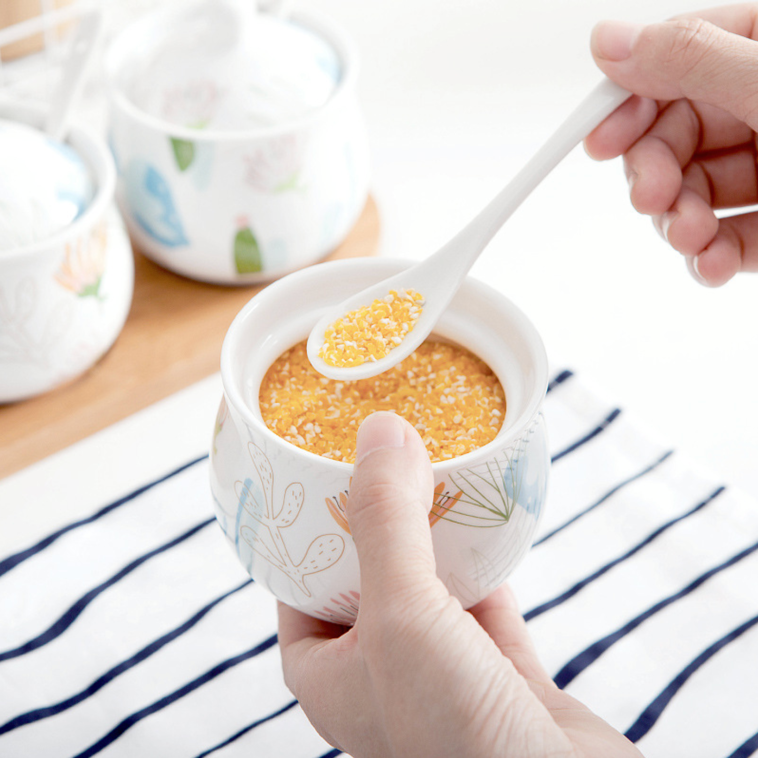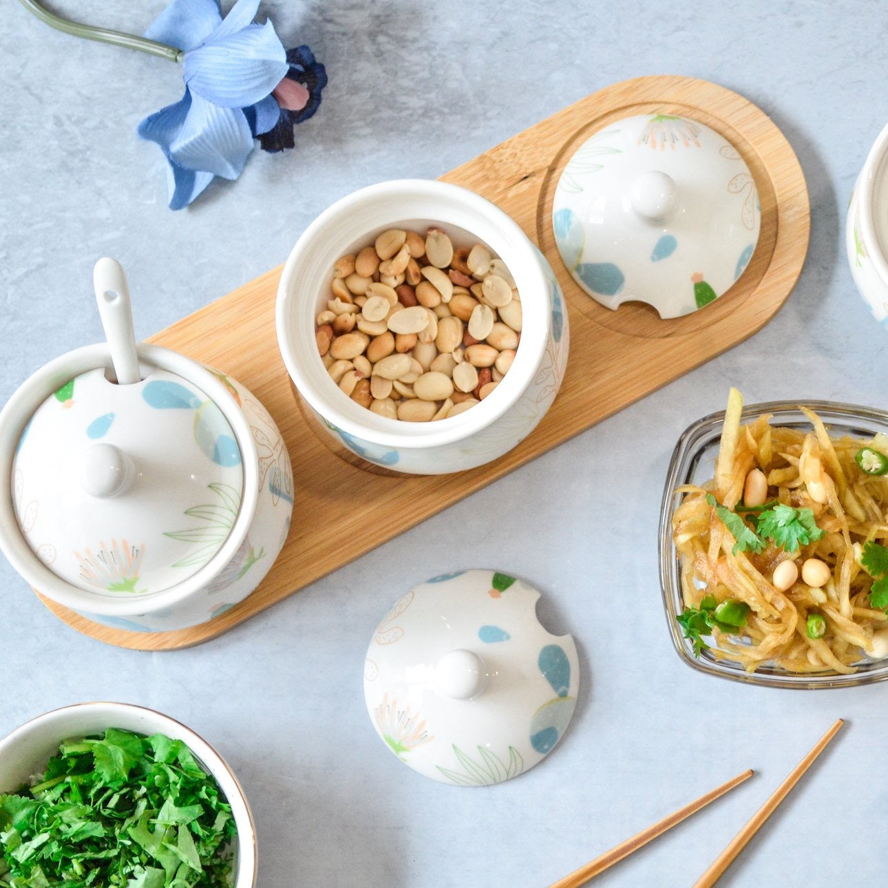 The three piece jar set adds a floral flavour to the kitchen. Each of the spice jars have a botanical leaf design. The jars have dedicated spoons and the set comes with a wooden tray.