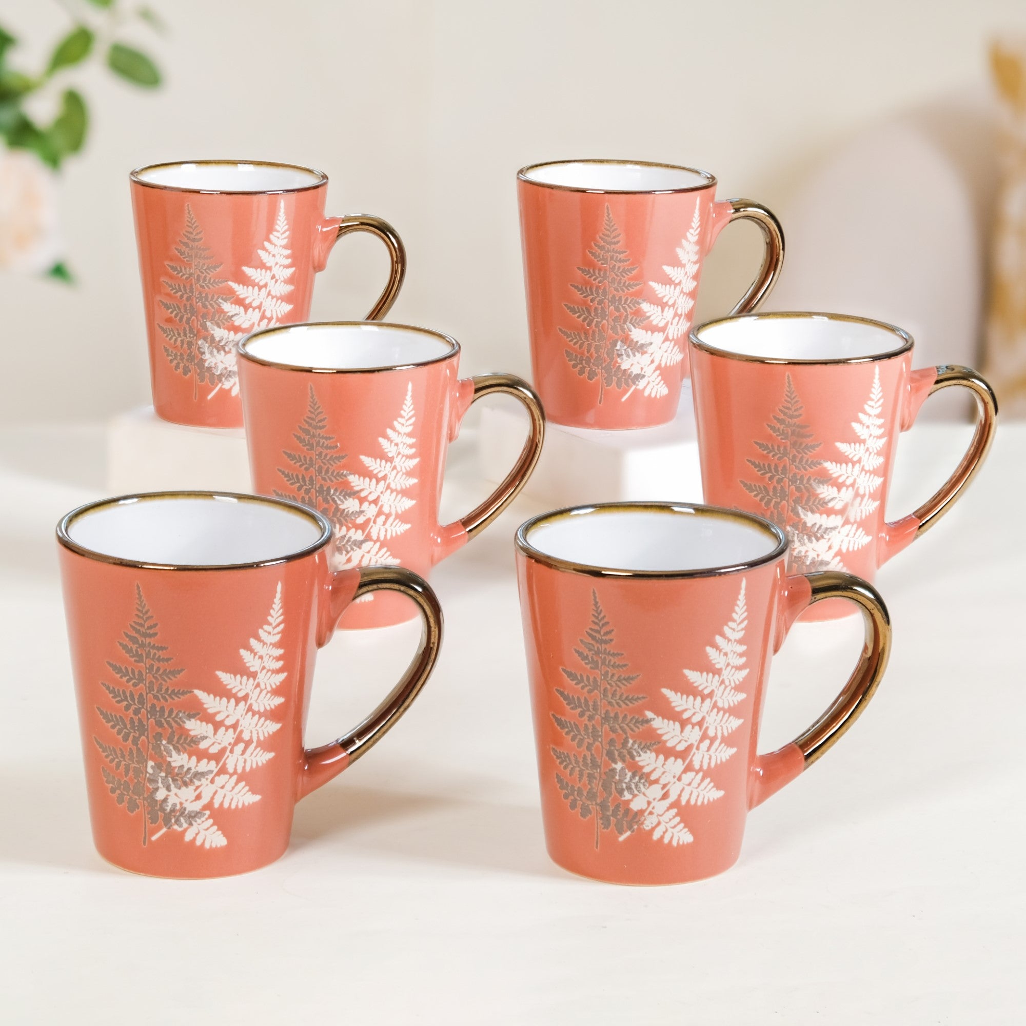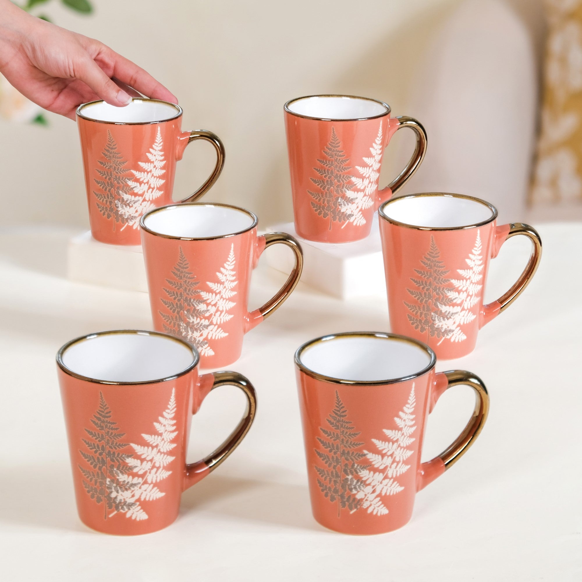 The fern leaves metallic design coffee mug set is truly unique due to its exquisite design and attention to detail. Each of the 6 mugs in the set features a stunning fern leaves pattern meticulously captured through premium silk screen printing on a vibrant orange canvas. The opulent gold metallic accents on the rim and handle add a touch of luxury to every sip, making your coffee or tea experience truly special. The combination of natural elegance and metallic glamour sets these mugs apart from ordinary ones, making them a standout addition to your kitchenware collection.