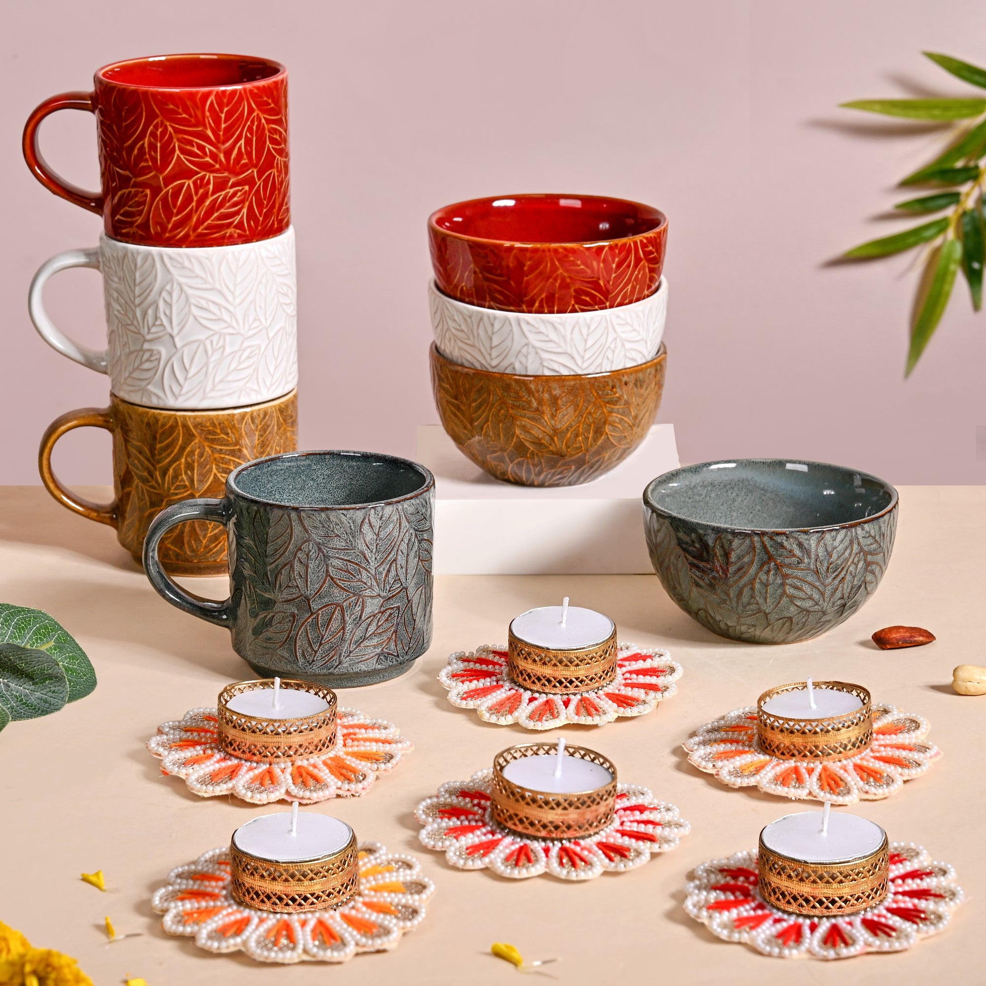 The stunning Diwali gift hamper offers a perfect blend of elegance and tradition. It includes a set of four ceramic teacups, each engraved with a delicate leaf pattern in four sophisticated colours - white, green, red, and yellow ochre. The set of four ceramic snack bowls, featuring an embossed leaf design in earthy hues, adds charm to your dining experience.