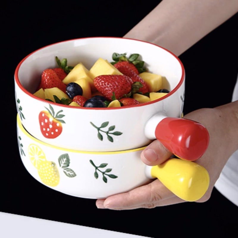 The Lemon Bowl is a ceramic serving bowl with lemon illustrations. It has a handle which makes it easy to lift and serve.