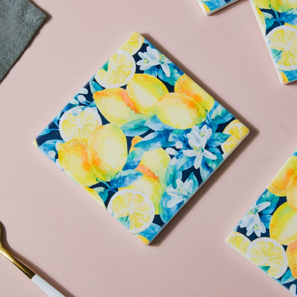 Lemon Matte Ceramic Square Tile Coaster Set Of 4