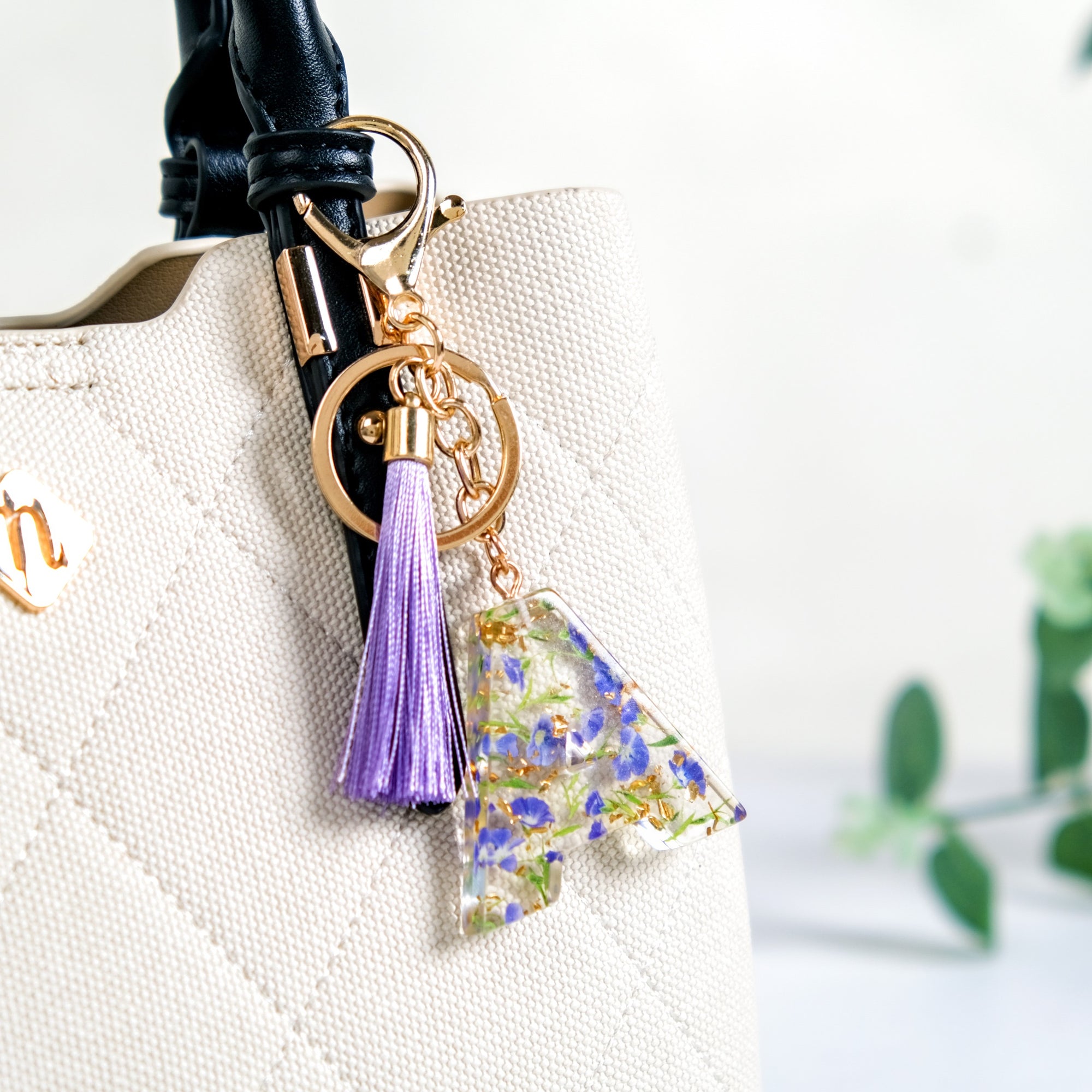 The “A” resin keyring exudes grace with its translucent resin base infused with lavender blooms. The delicately pressed forget-me-not flowers also known as scorpion grass, are encased within the resin, symbolising enduring memories. The keychain is also accentuated by flecks of golden foil paper.