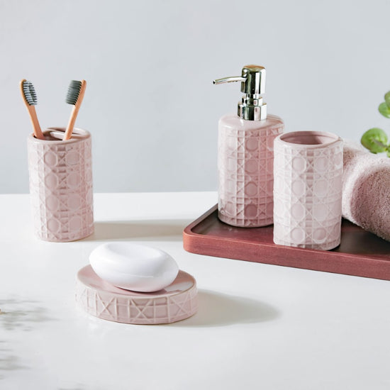 The ceramic set of 4 consists of a dispenser for storing liquid soaps, two tumblers for keeping the essentials, and one soap dispenser to rest the soap and keep it within reach.