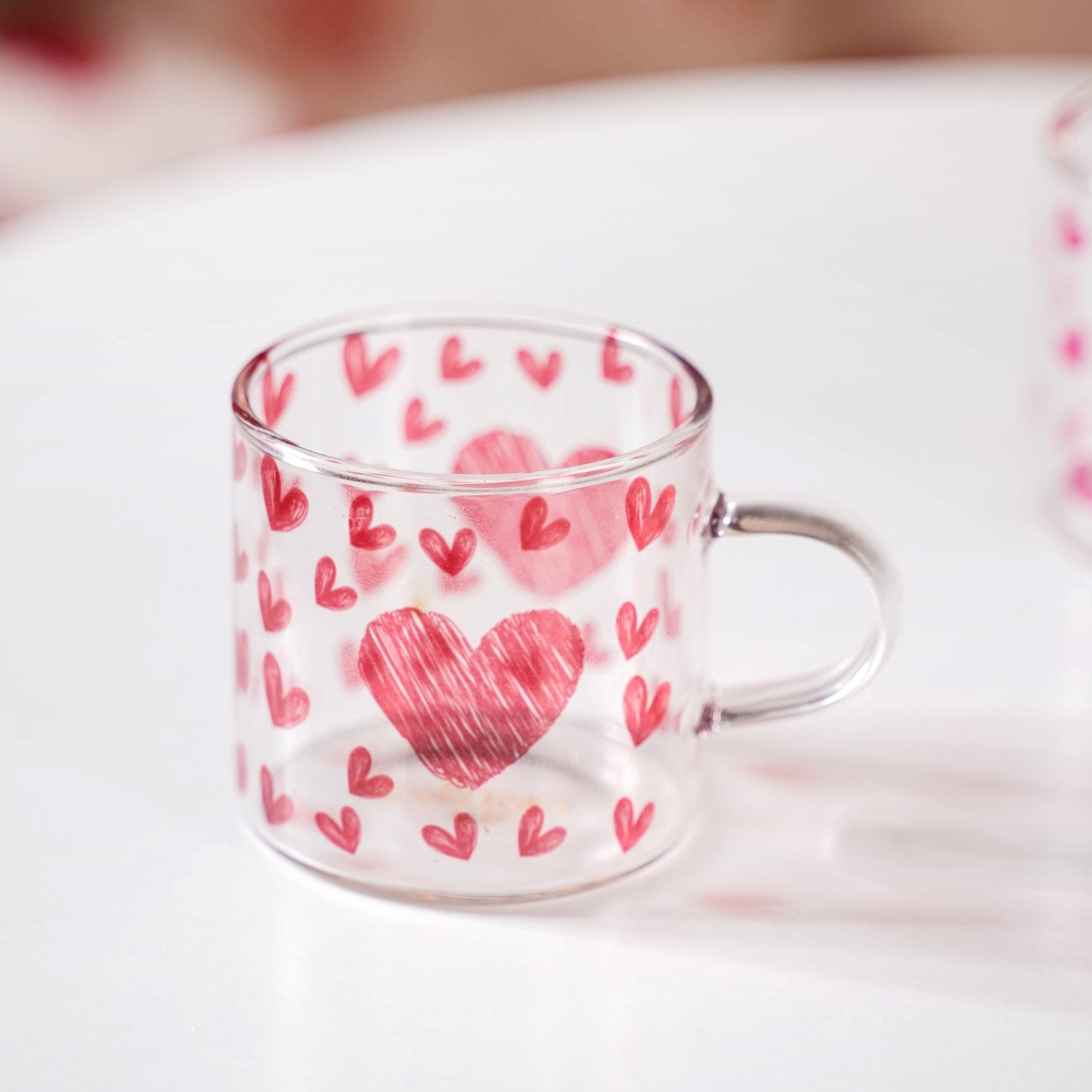 Design: Playful, bold, and artistic, this glass tea cup set is designed to brighten up your drinkware collection. Featuring two different designs, one that showcases delicate dark pink hearts while the other, adorned with vibrant, red hearts, each teacup brings its own flair and charm. Together, they make a perfect pairing for those who appreciate both subtlety and boldness in their drinkware.
