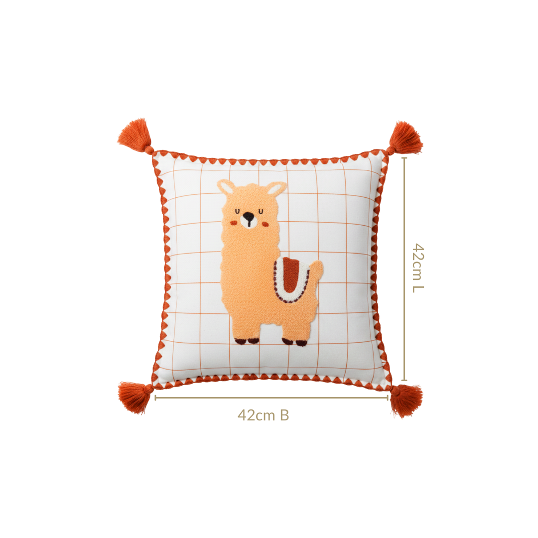 Design: This cover is crafted from soft cotton and set against a pastel grid backdrop. Tassels on all four corners and neat embroidered borders add subtle texture. At the centre, a vibrant llama motif steals the spotlight. The concealed zipper blends smoothly into the design, and its square silhouette keeps the look clean and structured. After washing, the cotton may tighten slightly, giving the cover a naturally cosier fit. A gentle round of ironing will ease the fabric back to its original shape, keeping the finish smooth and fresh.