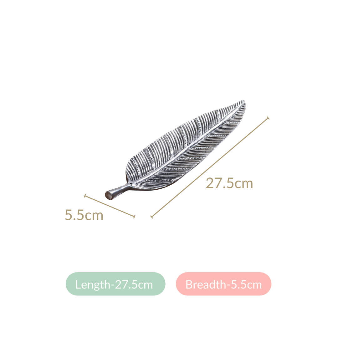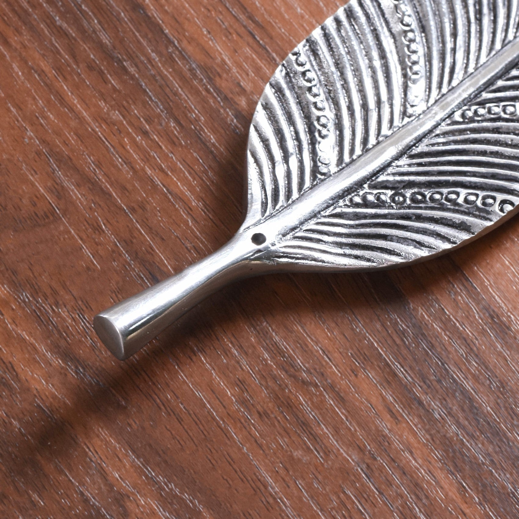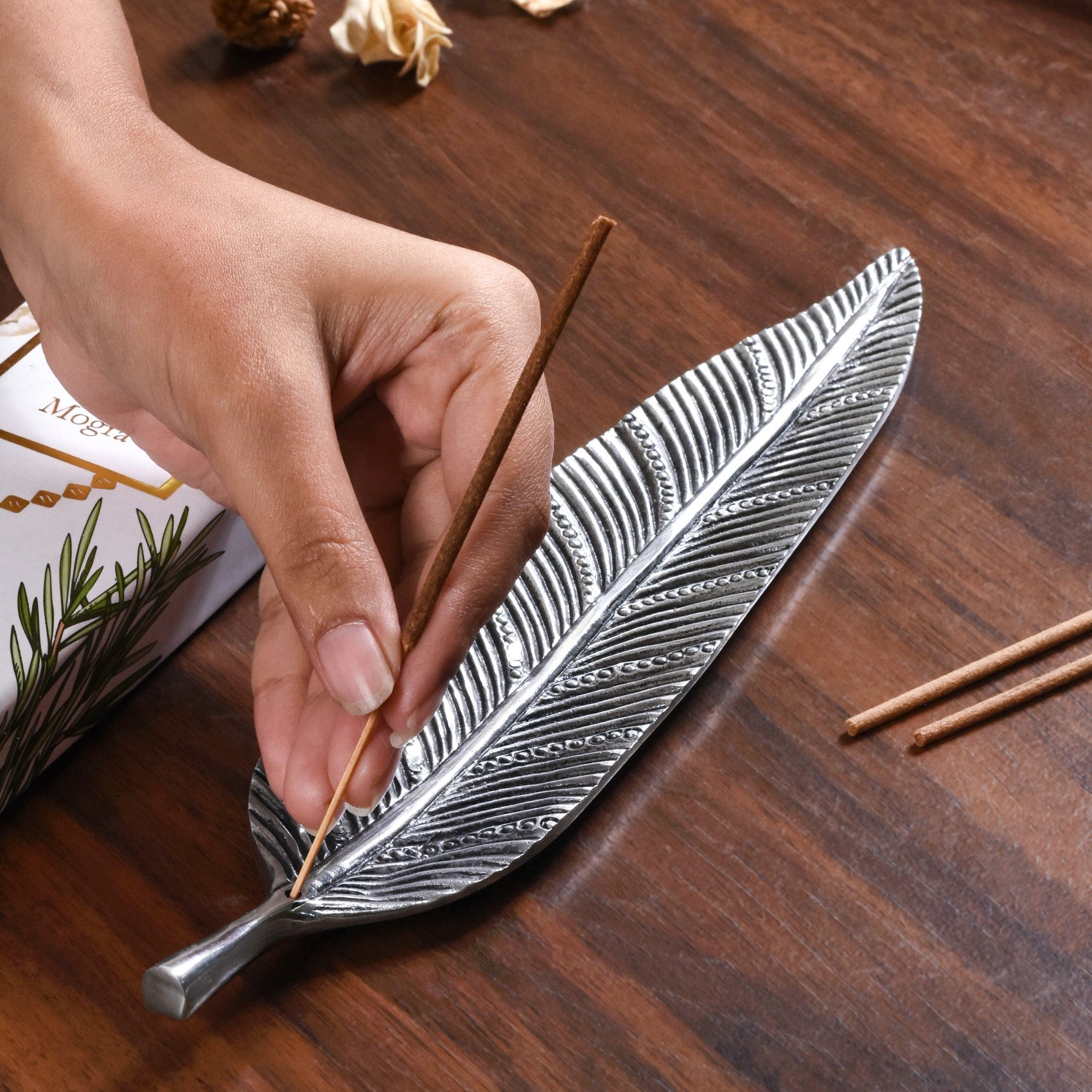Elevate your spiritual practices and home ambience with our exquisite incense ash catcher, crafted from premium-quality aluminium for unparalleled durability and elegance. Designed in a unique leaf shape with intricate textured detailing, this agarbatti metal stand adds a touch of natural beauty to any space. Its traditional style and antique finish exude timeless charm, while its rust-resistant construction ensures long-lasting use. Whether seeking moments of tranquillity or simply enhancing your decor, our aluminium incense holder is the perfect choice for elevating your environment with grace and style. The ash catcher comes with a box of mogra-scented all natural incense sticks.