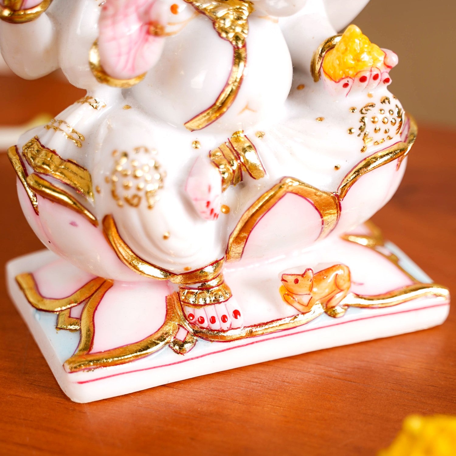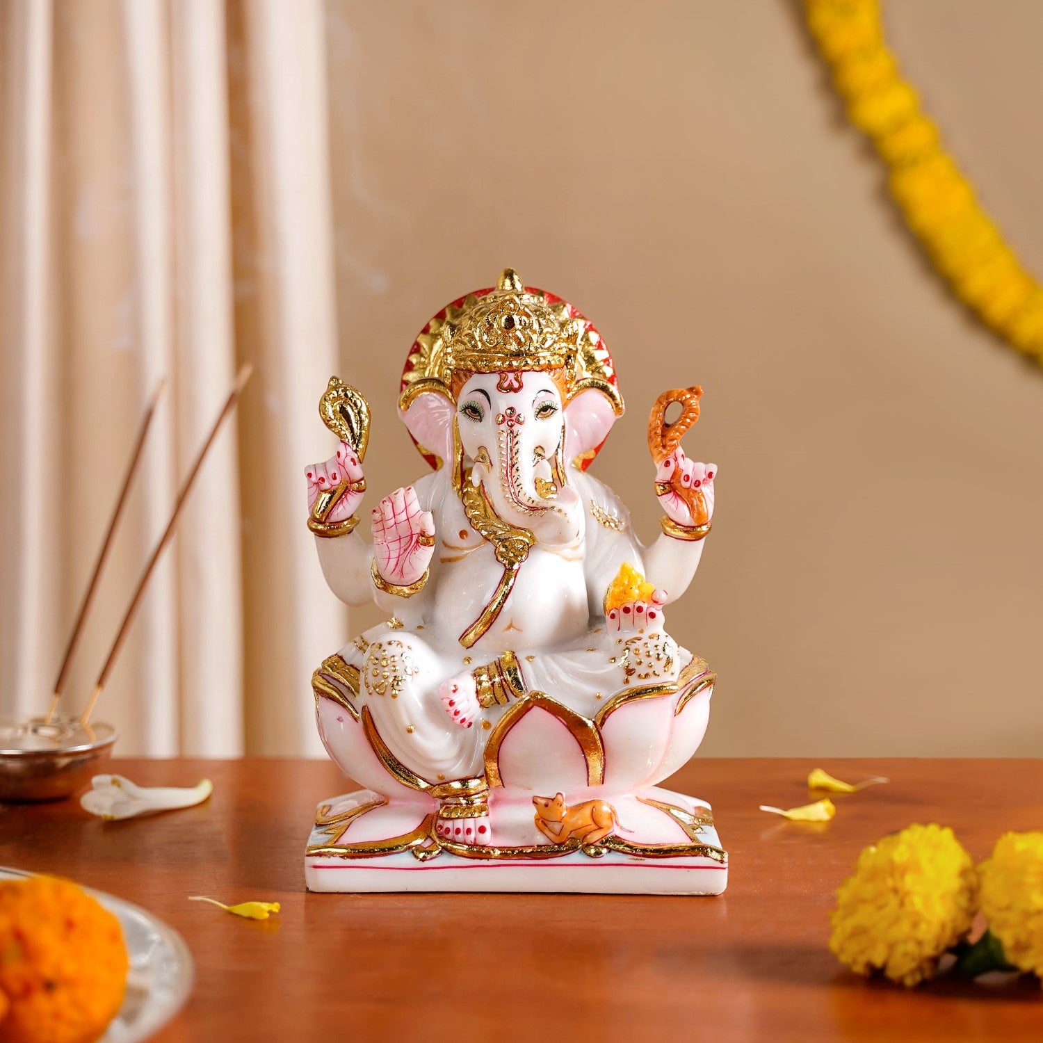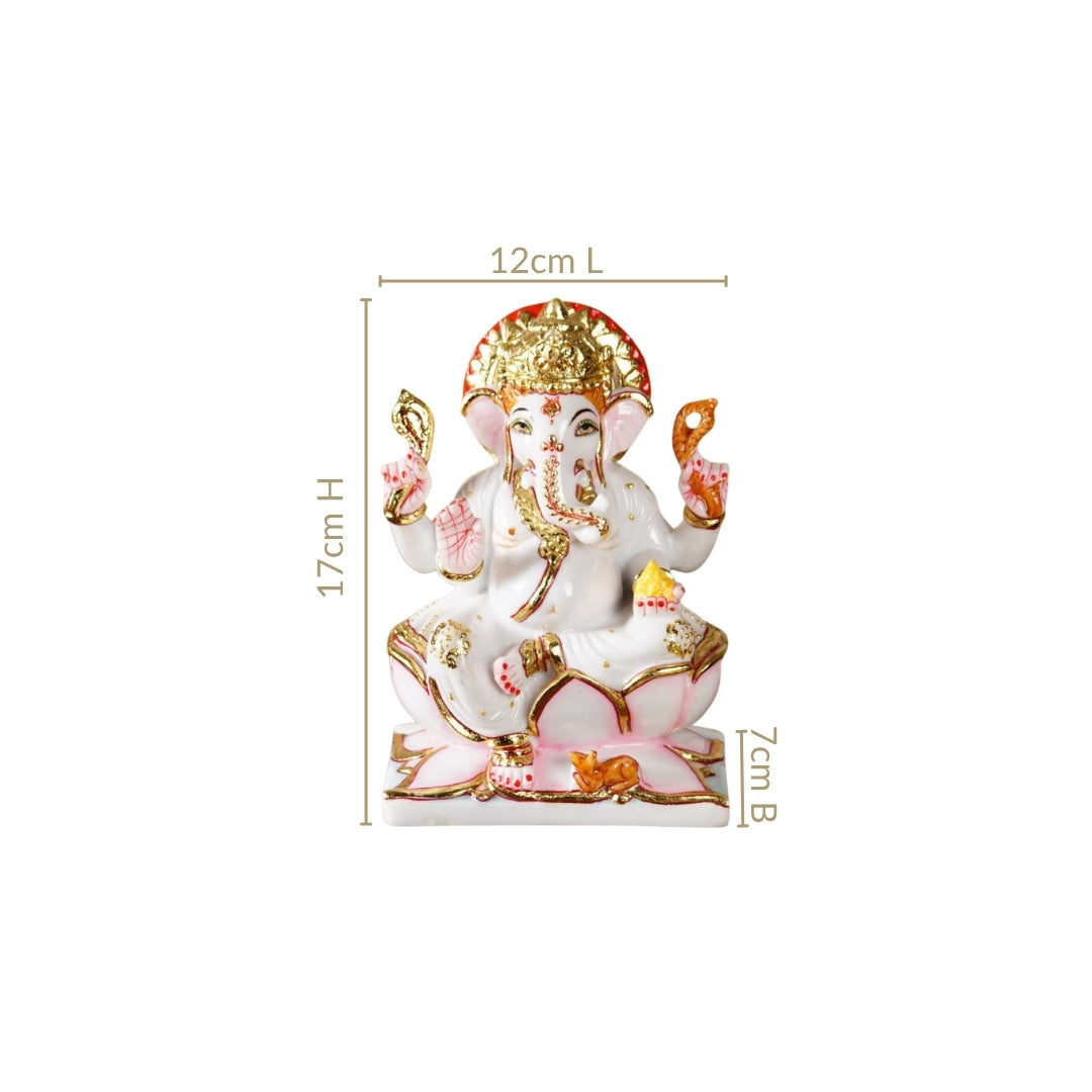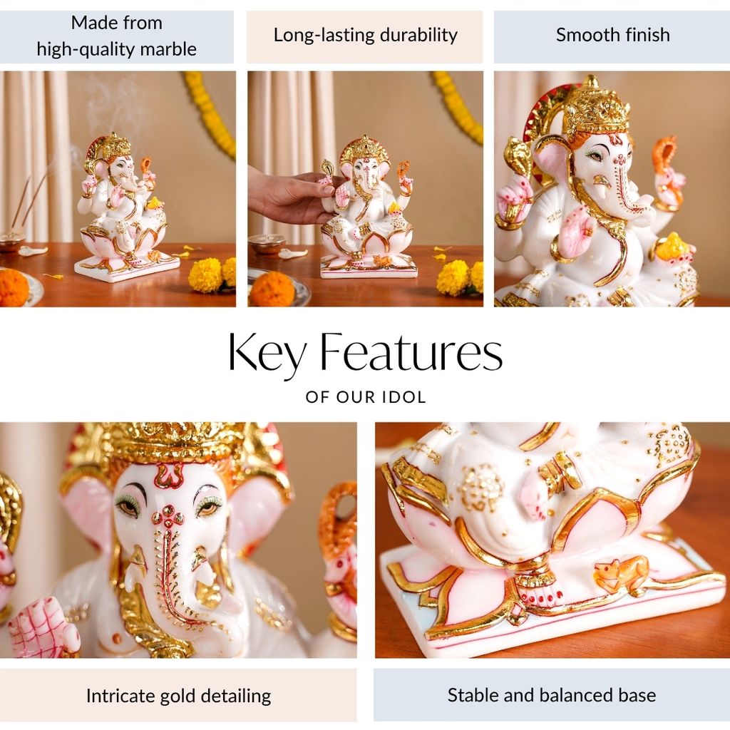 Design: This Ganesha idol is crafted from pristine white marble, serving as a pure base for the vibrant design elements in pink, red and gold. It is a Chaturbhuja Ganesh Murti. One hand is depicted giving blessings to devotees, while another holds a laddoo. The remaining two hands gracefully hold divine embellishments. At the feet of the god, a mouse, Lord Ganesha's vahan, is seen crouched. The god is depicted peacefully seated on a lotus, and a circular aura of light encircles Ganesha's head, giving the idol a sacred presence perfect for a home temple. The gleaming gold mukut adds a touch of divine opulence to the idol.