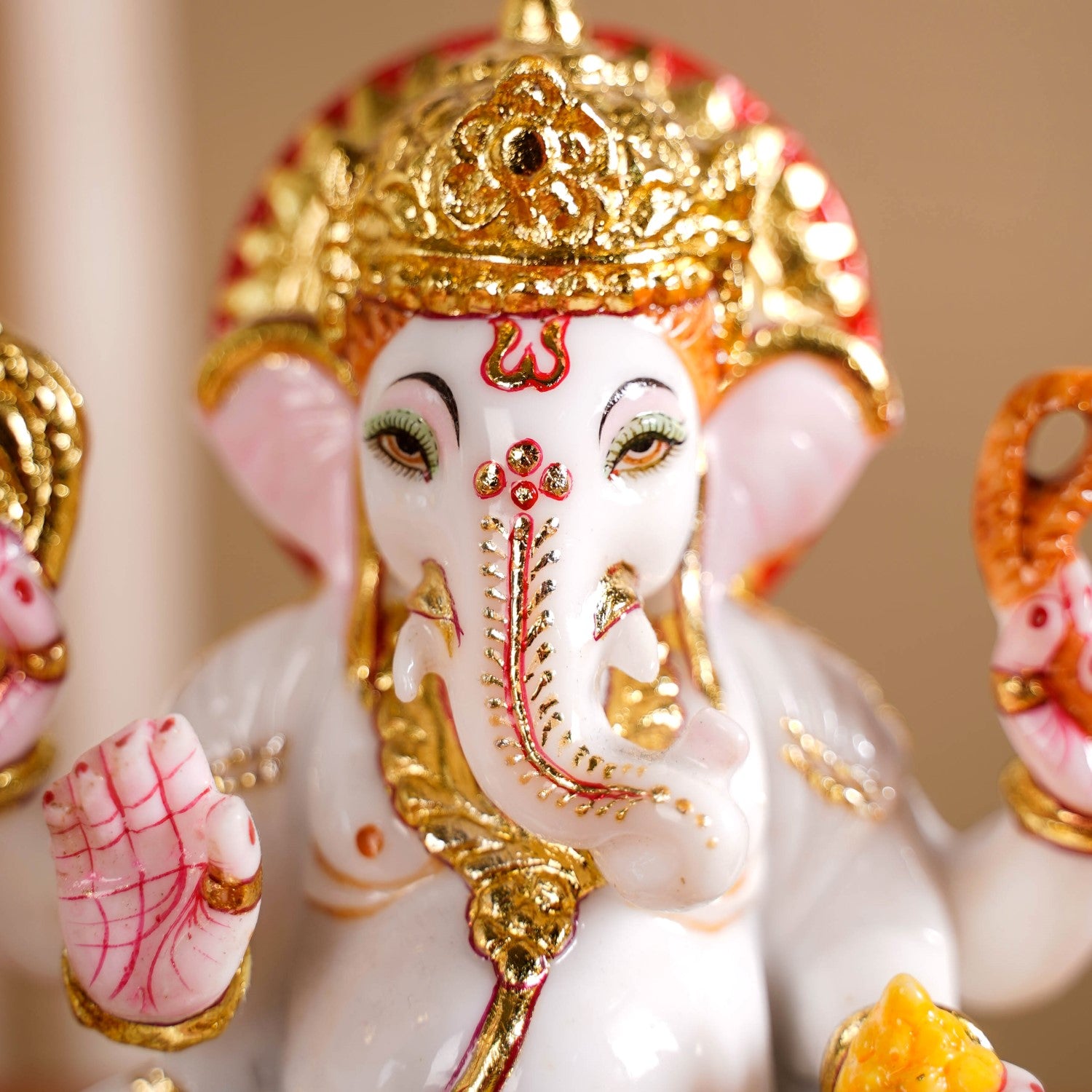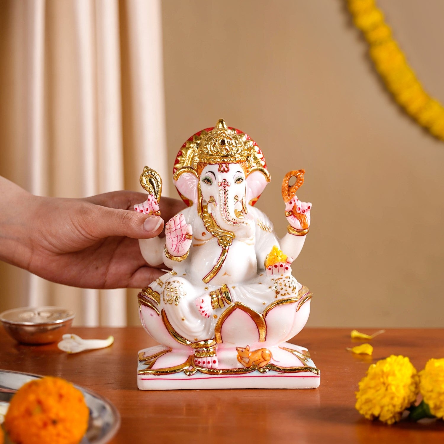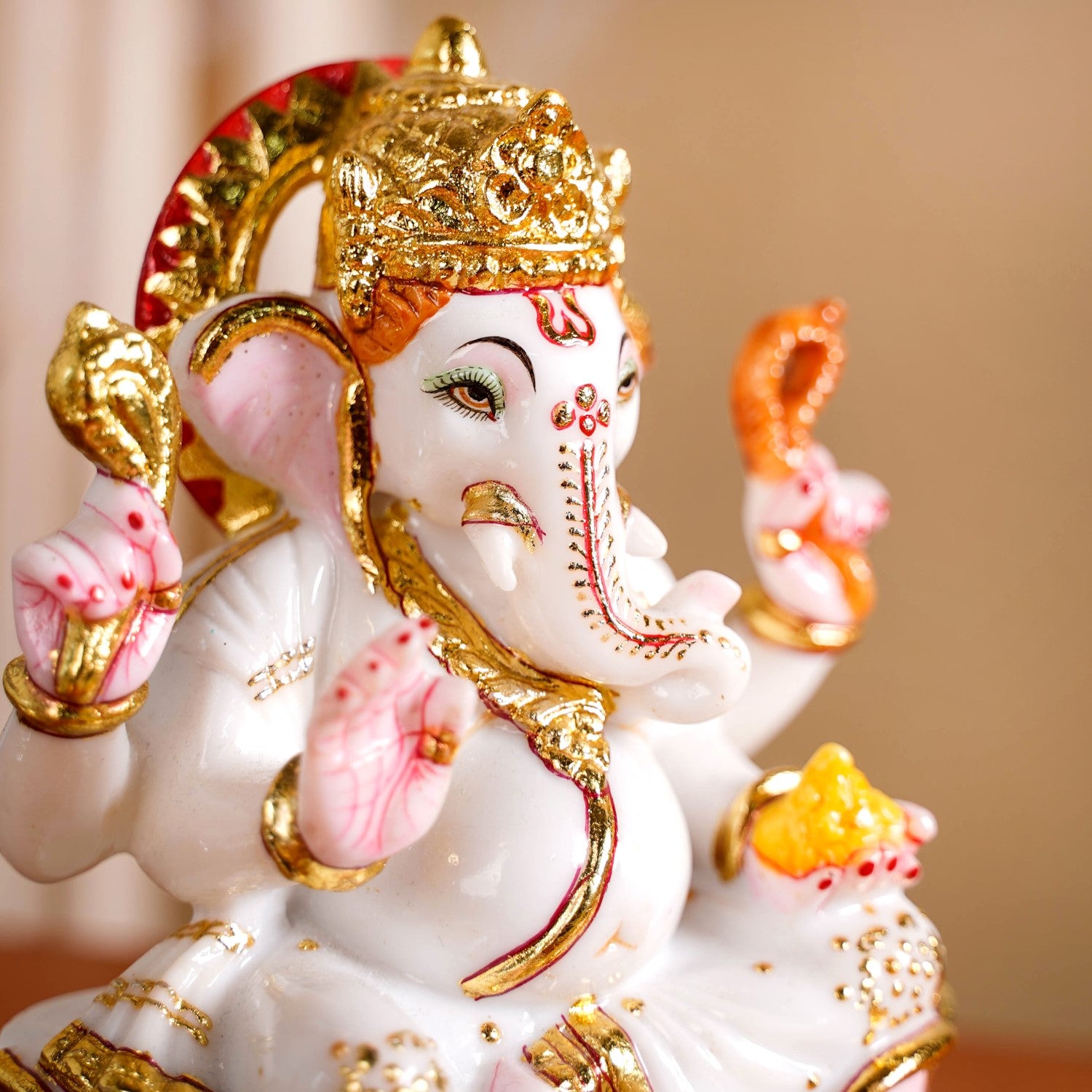 Benefits: Its high-quality marble construction ensures it is very durable and will last for a long time. The vibrant colours and gold details are made to stay bright, keeping the idol looking beautiful over many years. Its stable base means it stands firmly, making it safe to display. Having this idol is believed to bring good fortune and help remove difficulties. It creates a peaceful and sacred atmosphere, making it a perfect addition to your home temple where it can be worshipped daily.