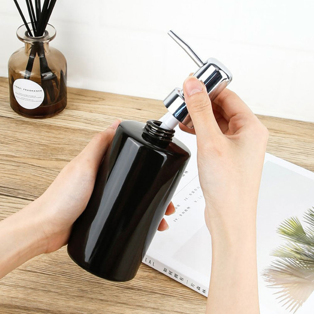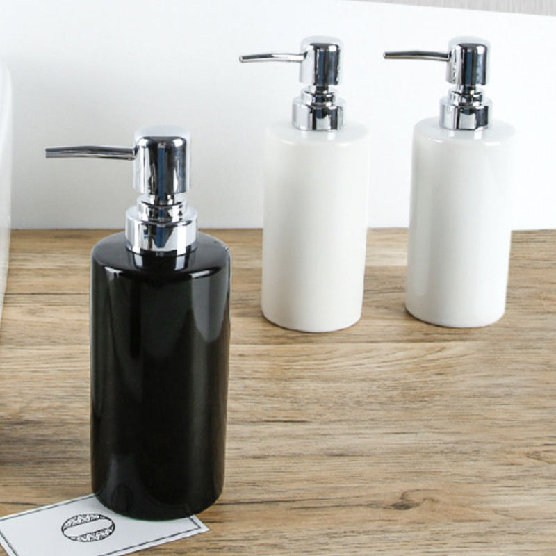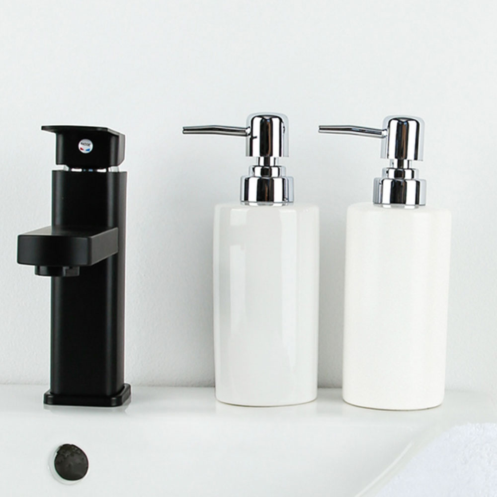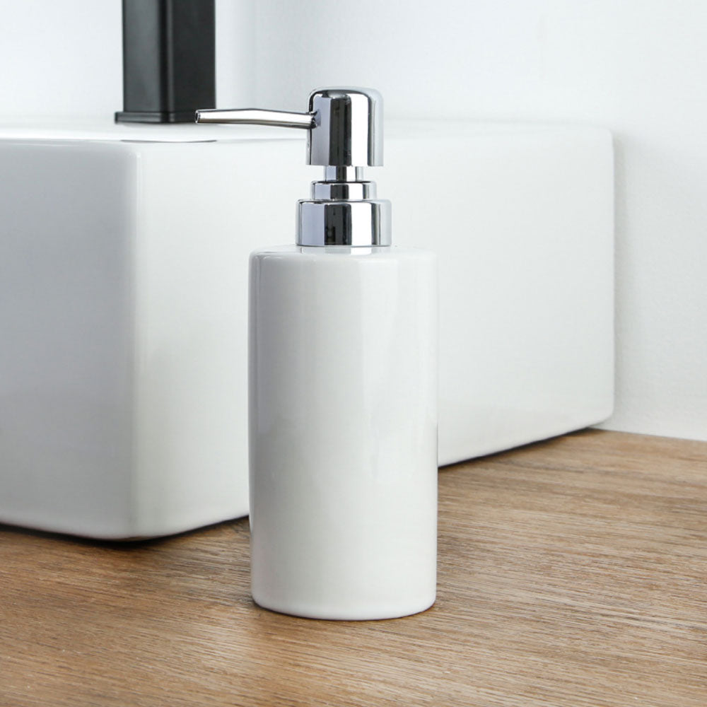 Lotion pump bottle made in ceramic that comes in white and black with a silver dispenser pump. The ceramic dispenser can not only be used as a lotion dispenser but can also be used as a liquid soap dispenser, hand wash dispenser, shampoo dispenser or body wash dispenser bottle. The pump bottle dispensers can blend into all bath settings with the classic colour tones.