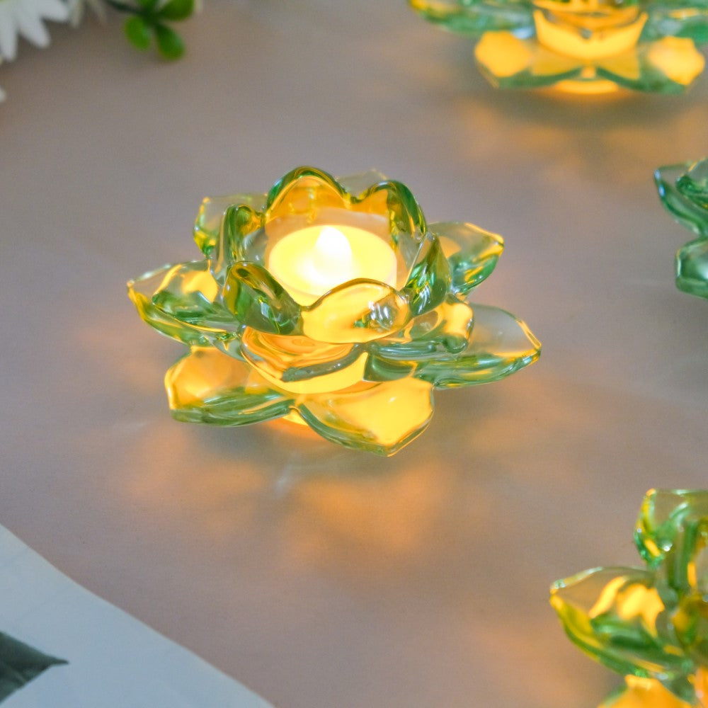 The green glass lotus-shaped tea-light holders can be used with LED tea lights, which are a safe and flameless alternative to traditional candles. LED tea lights provide the same warm and inviting glow as traditional candles, but they do not produce any smoke or soot. This makes them a practical choice for situations where an open flame is not desired or allowed.