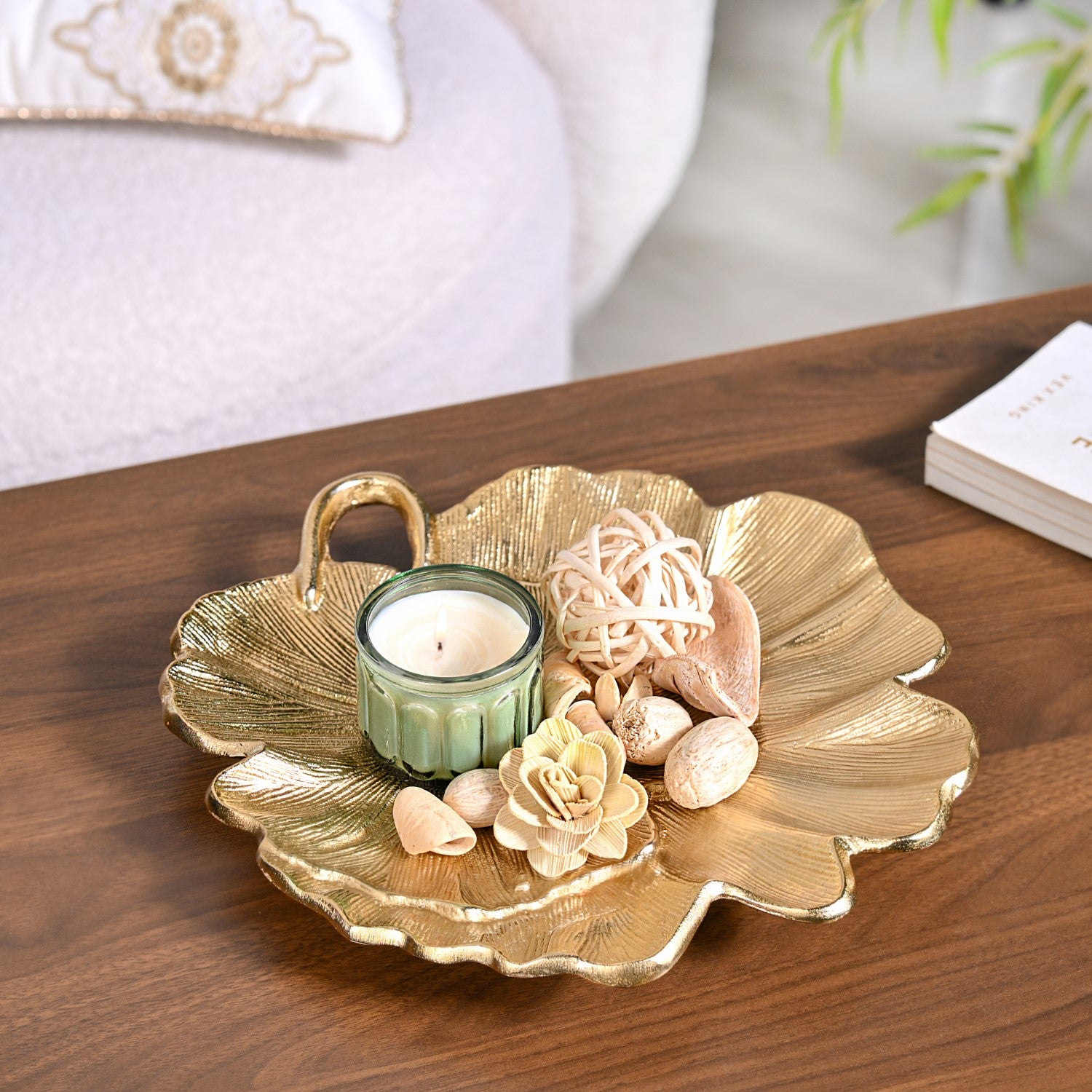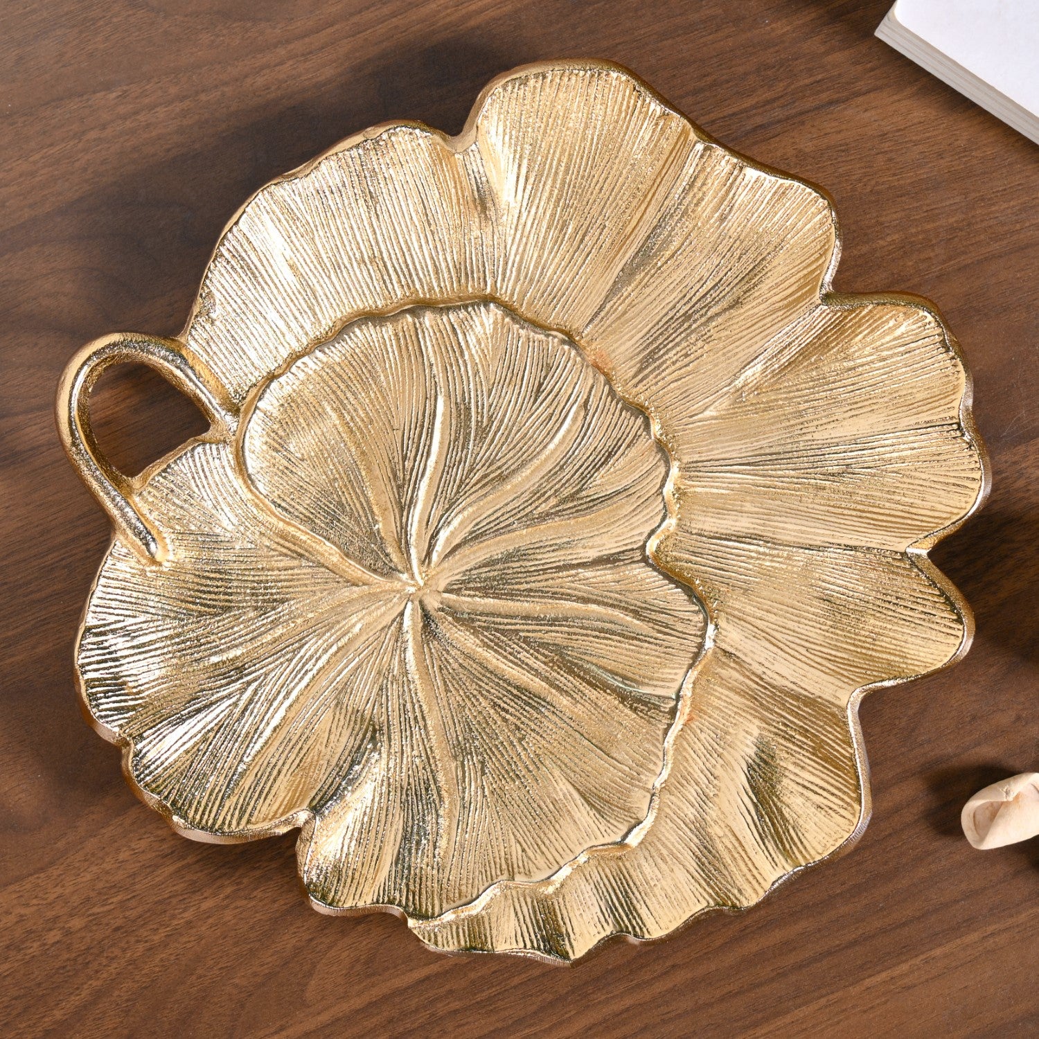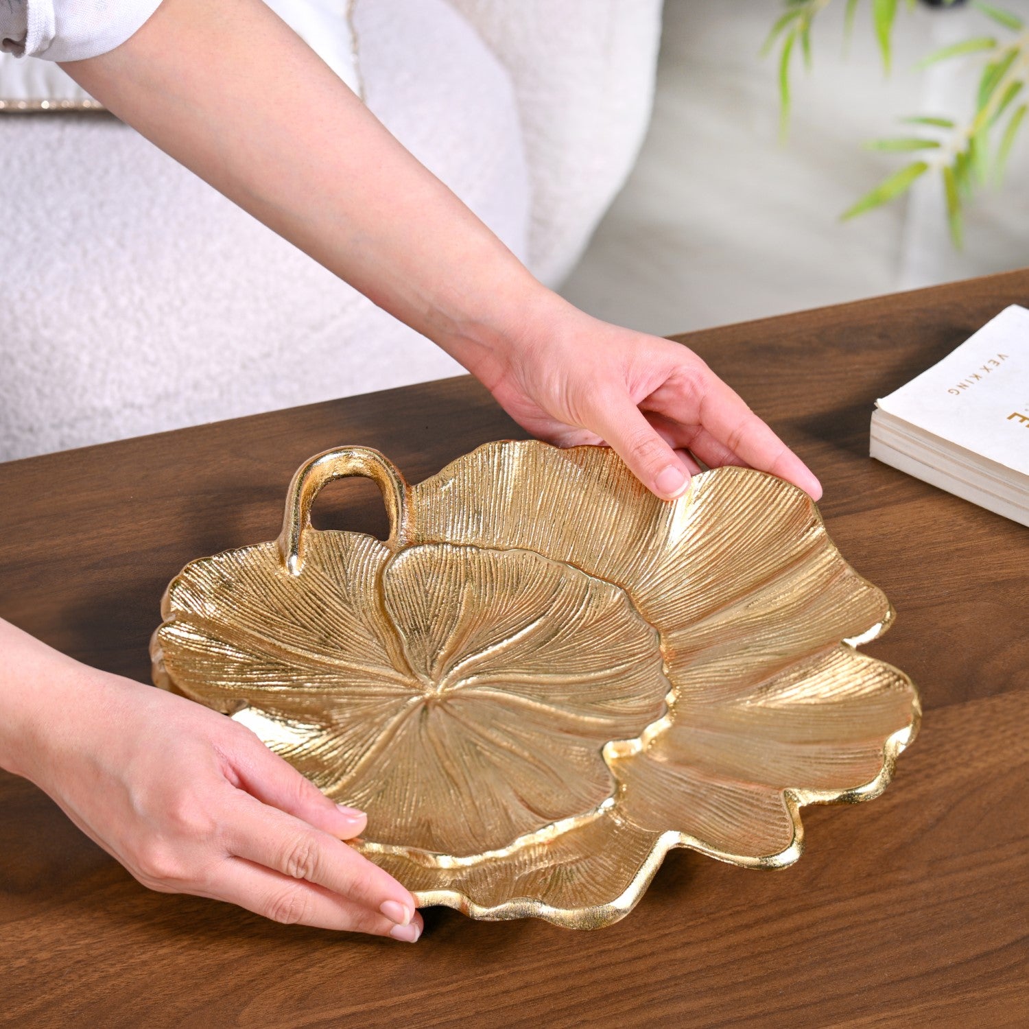 Design: This metal decor tray combines nature-inspired art with modern finishing. It is designed in the shape of an unfurled Lotus leaf with a metallic golden coating and curved edges. At the centre lies another Lotus leaf, creating an appealing layered effect. The deeply etched veining throughout the surface mimics the natural lines of the lotus’ actual foliage. These lines and grooves add dimension, adding movement and softness to this decor piece. A bent stem-like handle at one side complements the botanical feel and look of this product. The combination of fluid lines with metallic radiance gives this piece a timeless charm that suits both contemporary and traditional households.