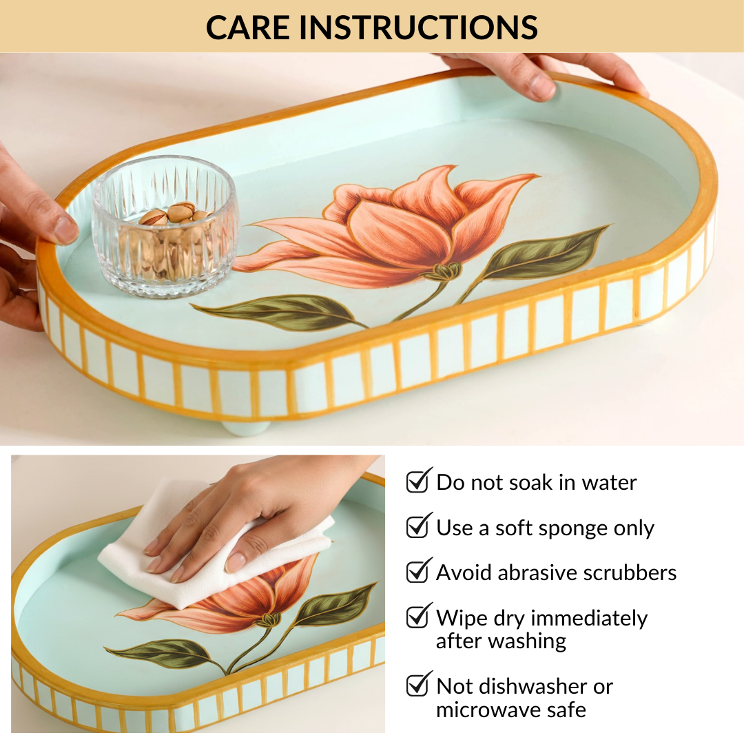 Design: Made from solid mango wood, the tray features a smooth capsule shape with gently raised edges. The surface showcases hand-painted floral motifs and food-safe lacquer coating that gives it a subtle sheen. A fine gold rim outlines the tray, while a four-leg base lifts it up. The structure is lightweight, stable and subtle on the eyes.