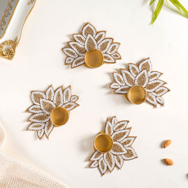 Embrace the festive spirit with our exclusive tea light holder set, designed to infuse your home with warmth and elegance. This set comprises four tea light holders, all sharing a captivating design and colour that embodies the essence of the season. Each tea light candle holder in the set features a graceful lotus design adorned with an array of vibrant, mini beads, meticulously arranged for a dazzling effect. Crafted with meticulous attention to detail, these tea light candle holders are made of elegant golden metal and feature intricate exterior patterns. When the candles are lit, they create a mesmerizing interplay of light and shadow. The tealight candle holders are ideal for enhancing your Diwali decorations, pooja celebrations, weddings, and more.