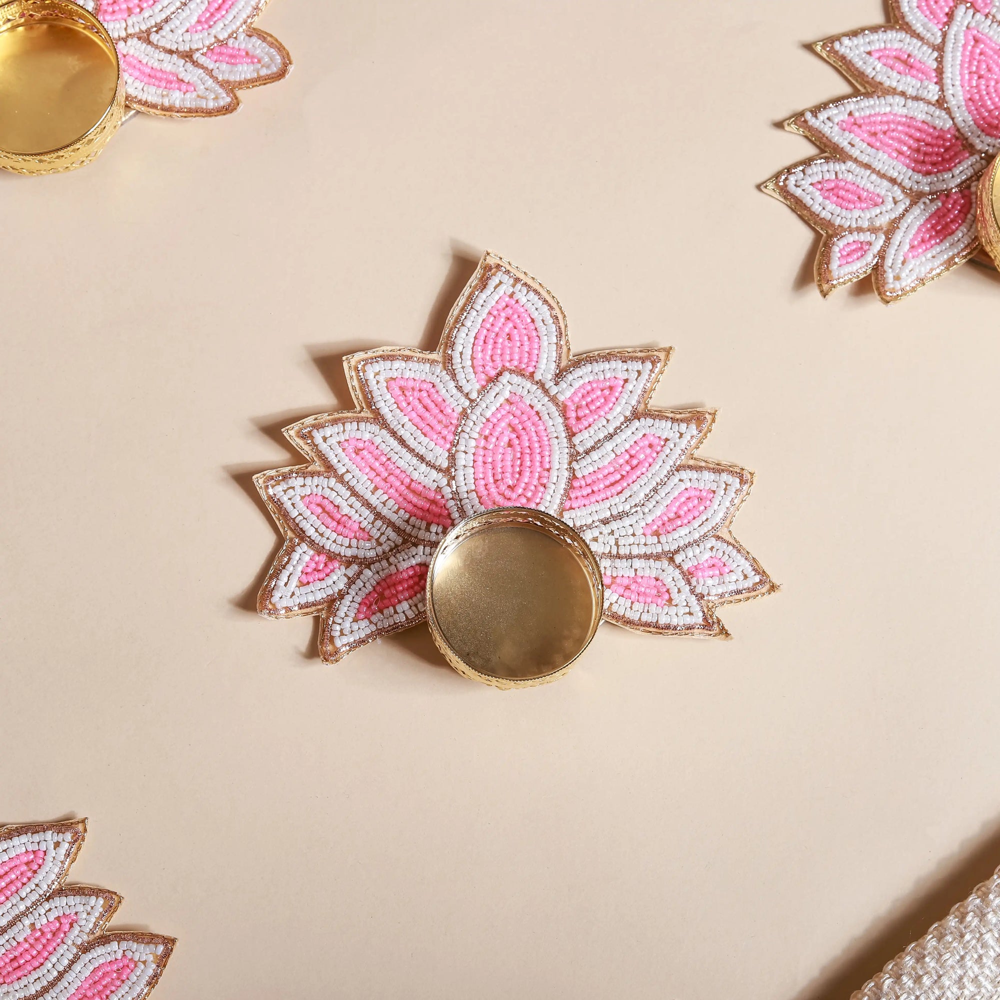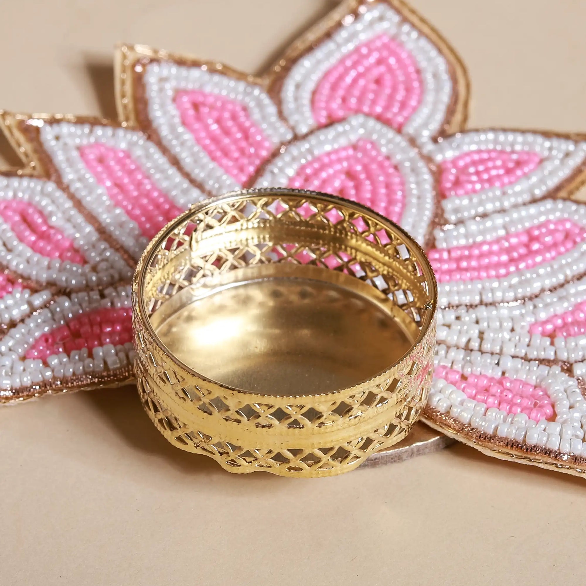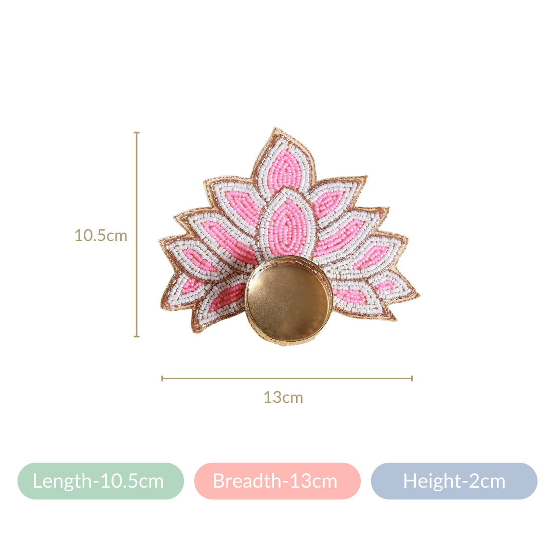 These tealight holders enhance the ambience of Diwali decorations and Pooja celebrations by infusing spaces with a serene and opulent atmosphere. The lotus-inspired design and vibrant beadwork bring an element of tradition and elegance to these occasions. When the tealight candles are lit within the holders, they cast intricate patterns of light and shadow, creating a visually stunning and spiritually uplifting environment that complements the festive and sacred nature of Diwali and Pooja celebrations.