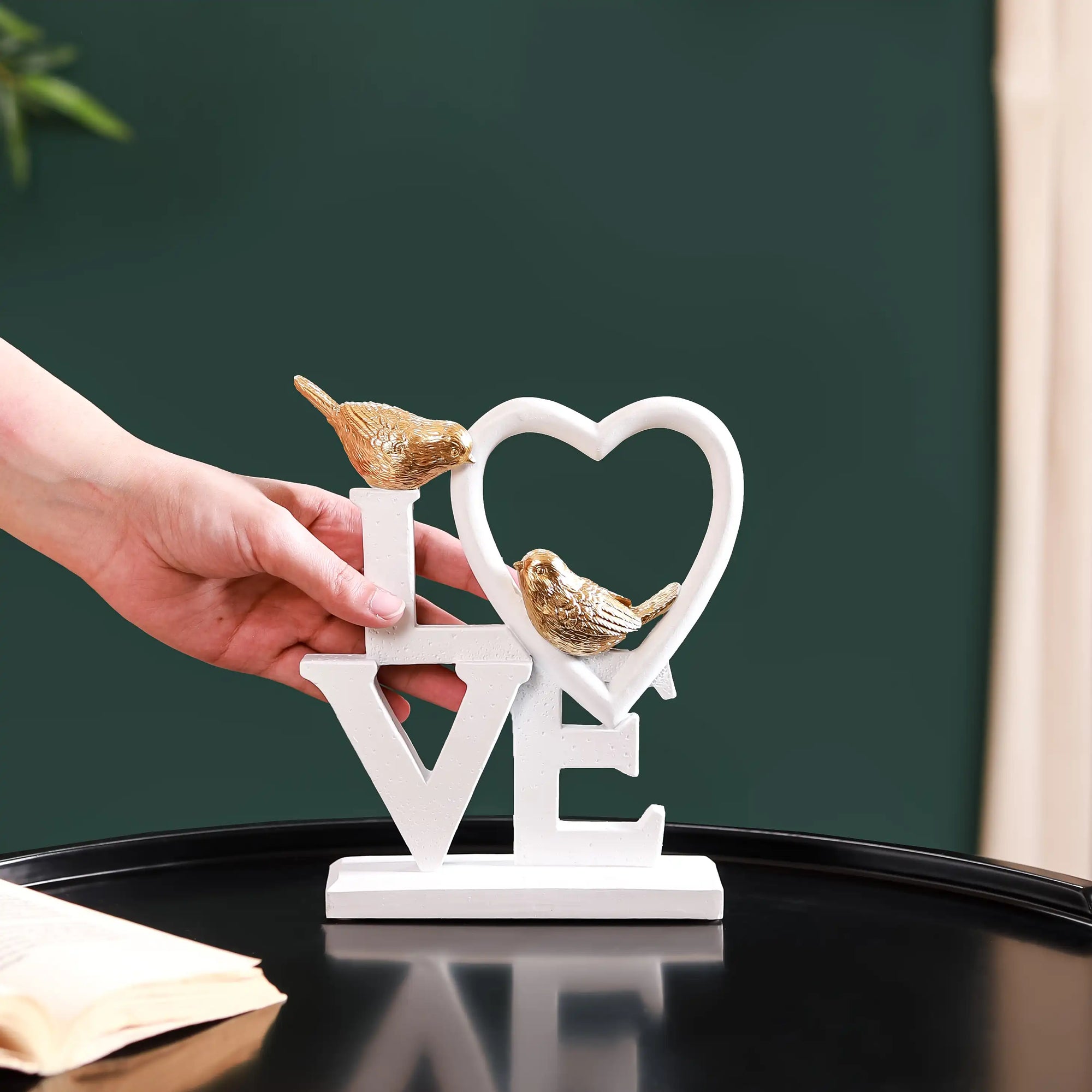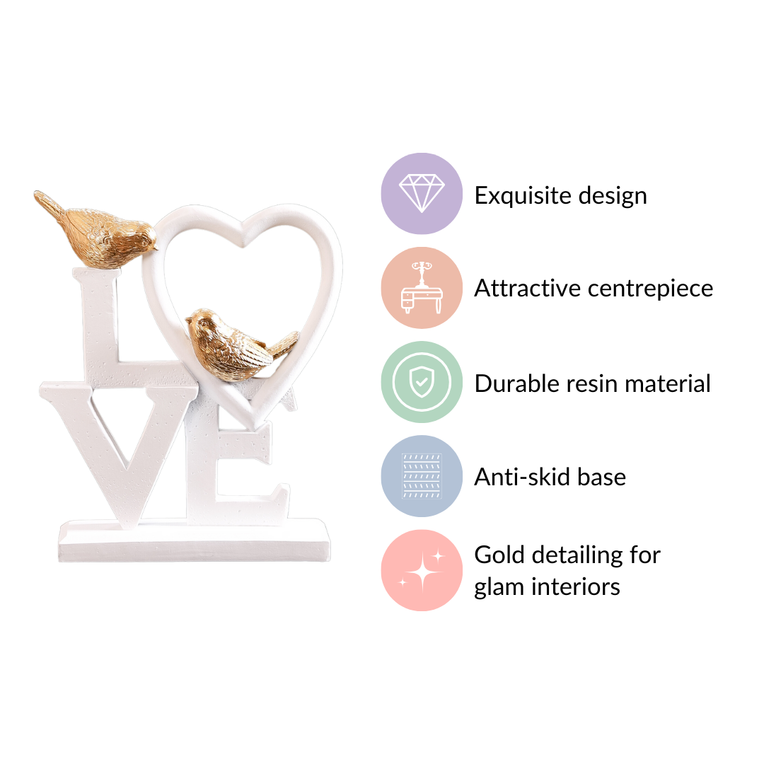 Elegantly capturing love and devotion, the white and golden showpiece spells 'Love' with a heart-shaped 'o,' symbolizing deep affection. In pristine white, the letters contrast beautifully with radiant golden accents. Graceful love birds perch atop, meticulously crafted for timeless elegance. A heartwarming reminder of love's power and connection's beauty, it enchants as a centrepiece or heartfelt gift. Infusing spaces with warmth, love, and allure, this masterpiece resonates joyfully.