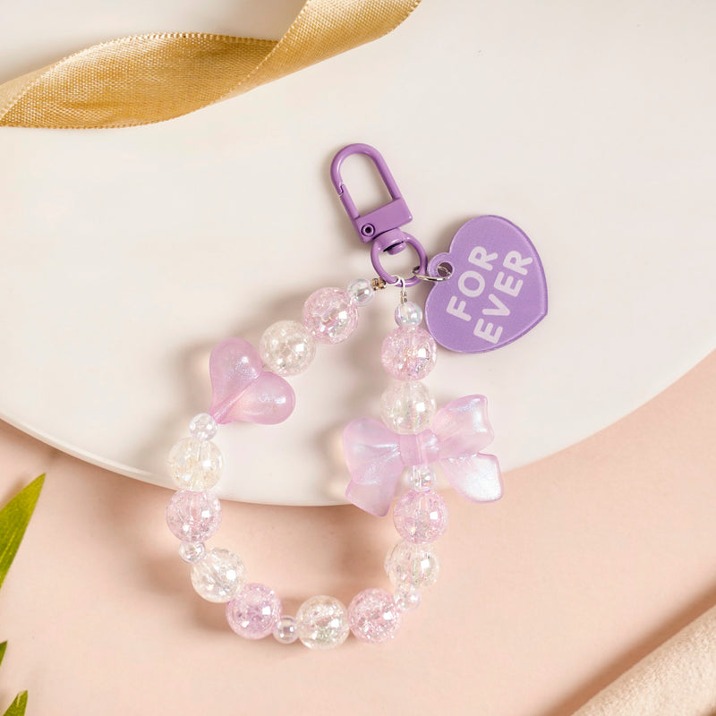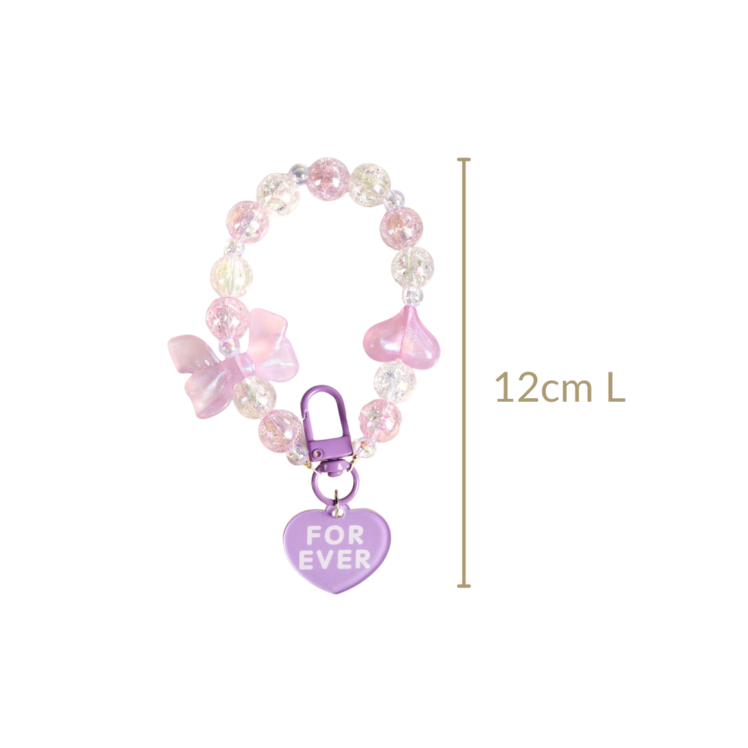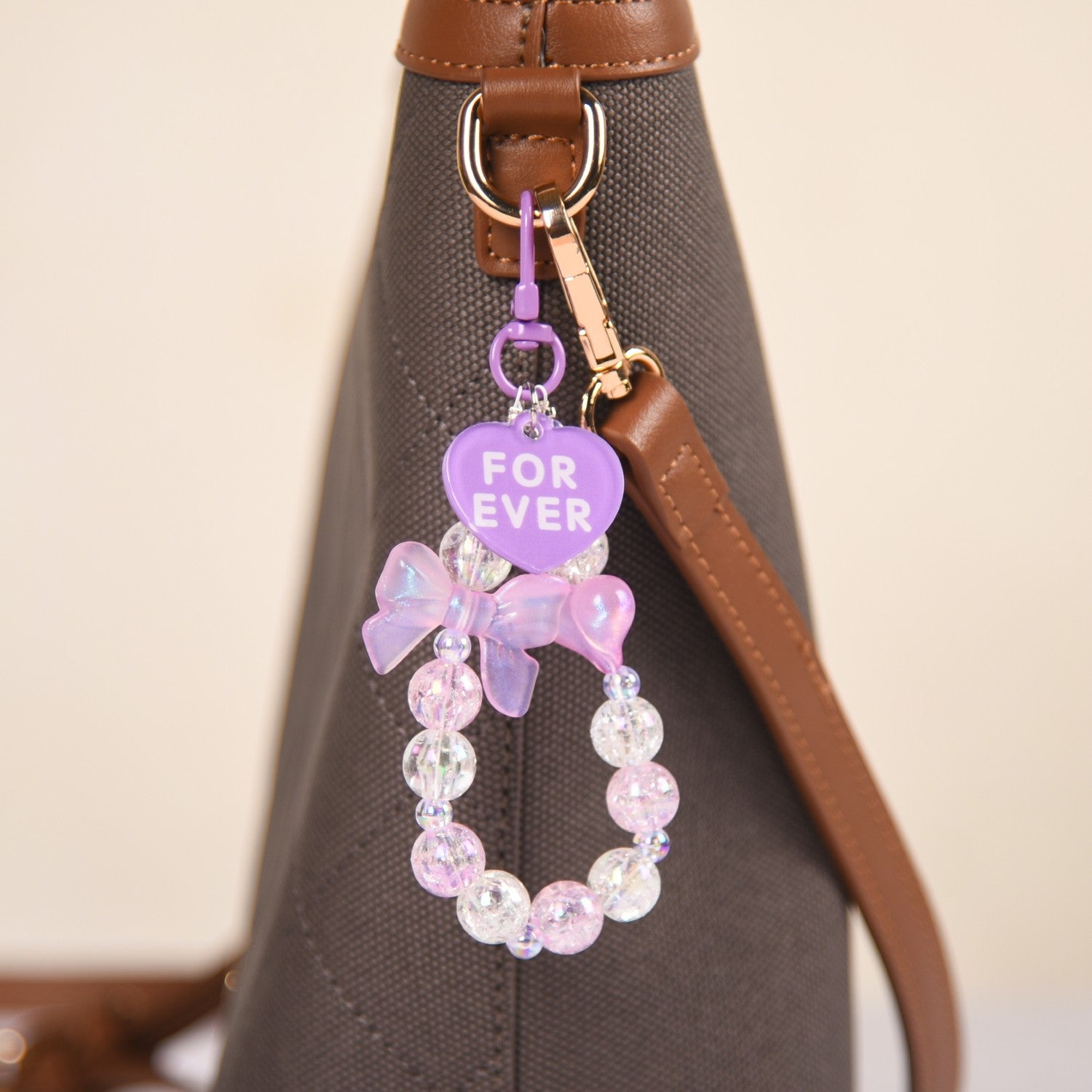 Carry a sprinkle of charm wherever you go with this dazzling keychain! Featuring a sparkling dangler with lavender and transparent beads, its iridescent shimmer catches the light like magic. A lavender heart charm with the message of "Forever" adds a sweet touch of sentiment to your style.