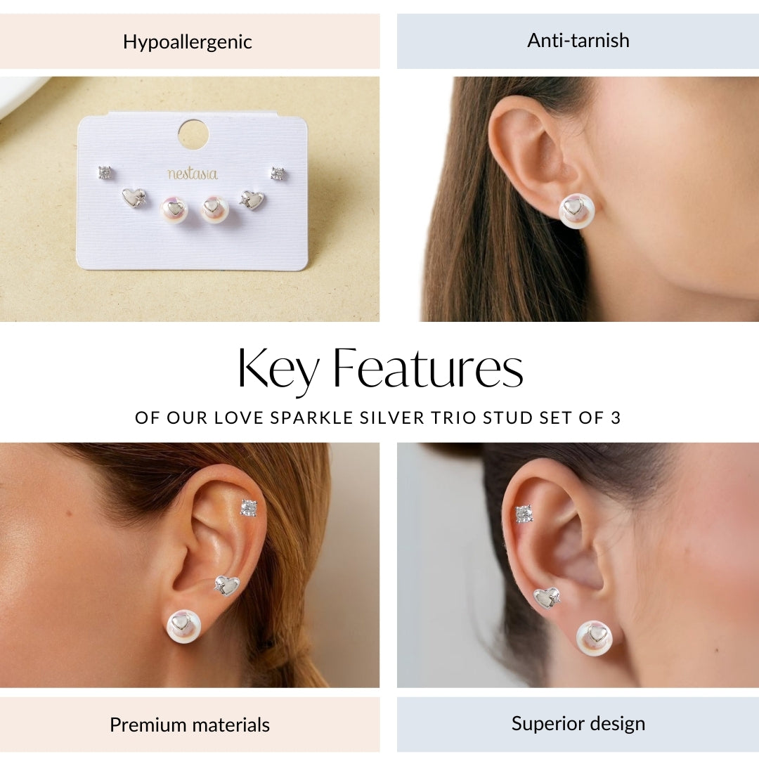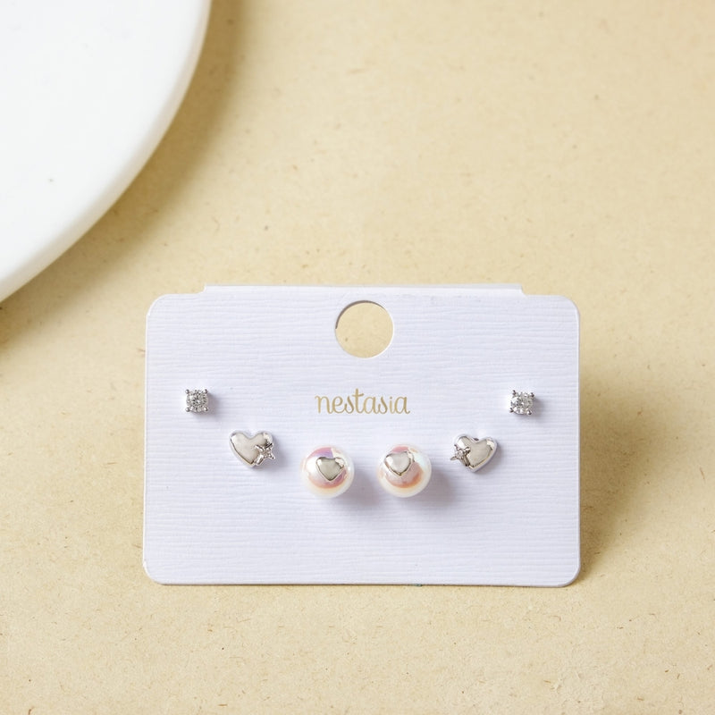 Nestyle: Wear the trio together for a stylish, coordinated look that pairs perfectly with a flowy dress or tailored blazer. The pearl heart adds a soft, romantic touch, while the sparkling metal heart and stone studs bring just the right amount of edge.