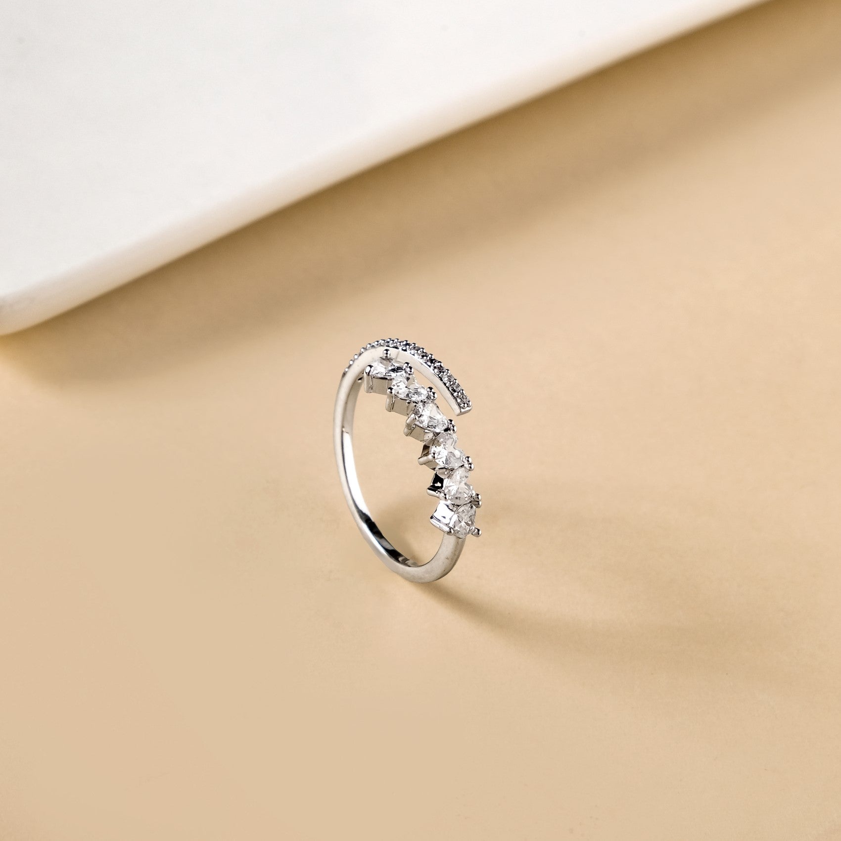 Love, but make it luminous! This silver bypass ring is all about effortless elegance with a touch of whimsy. One end flows into a series of dainty heart-shaped motifs, each twinkling with shimmering stones—because a little sparkle never hurts a love story. The other end? A sleek row of tiny, brilliant stones that add just the right balance of shimmer and sophistication. Open-ended yet beautifully connected, this ring is a modern symbol of love, light, and everything in between.