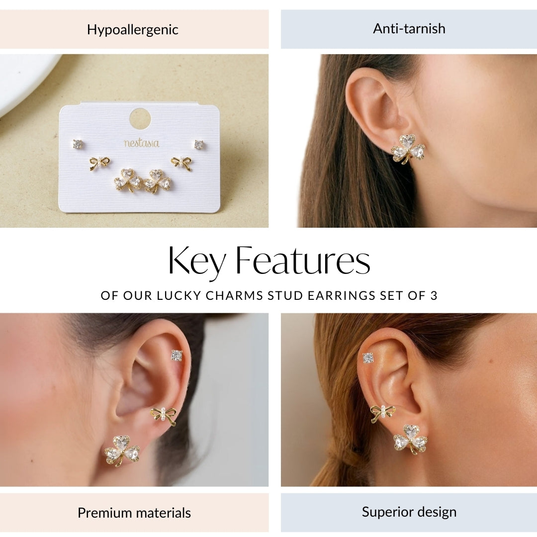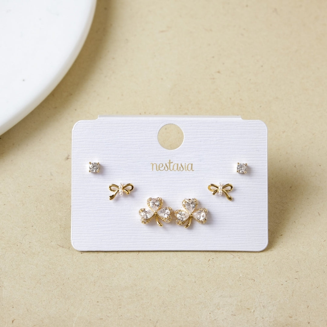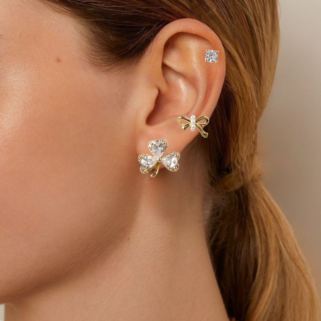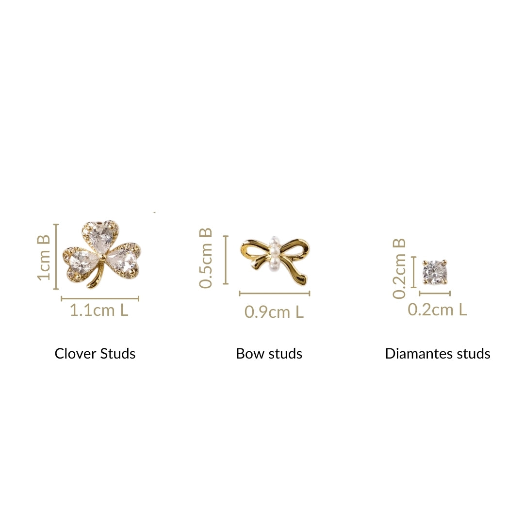 An audacious reimagination of a classic pairing of materials in the jewellery world, these stud earrings are both whimsically captivating and elegantly timeless in equal measure. Drawing inspiration from the concept of luck, each pair carries its own charm and symbolism. The first features a gold-toned three-leaf clover, adorned with shimmering diamantes to evoke prosperity and good fortune. The second showcases a dainty bow, delicately embellished with faux pearls, while the final pair offers a classic, prong-set diamanté stud, adding a refined sparkle to complete any look.