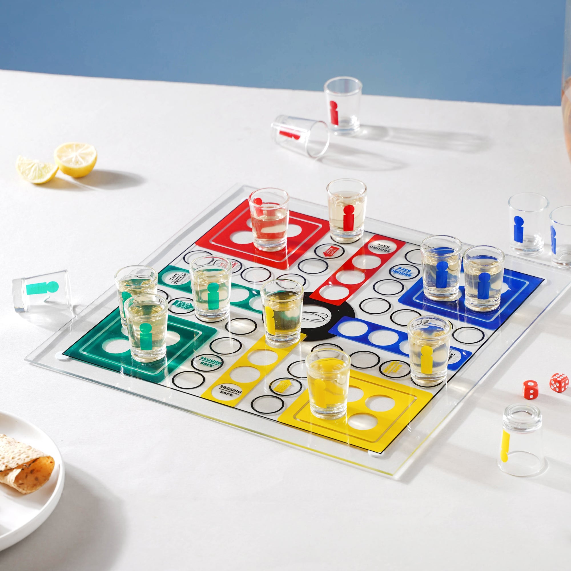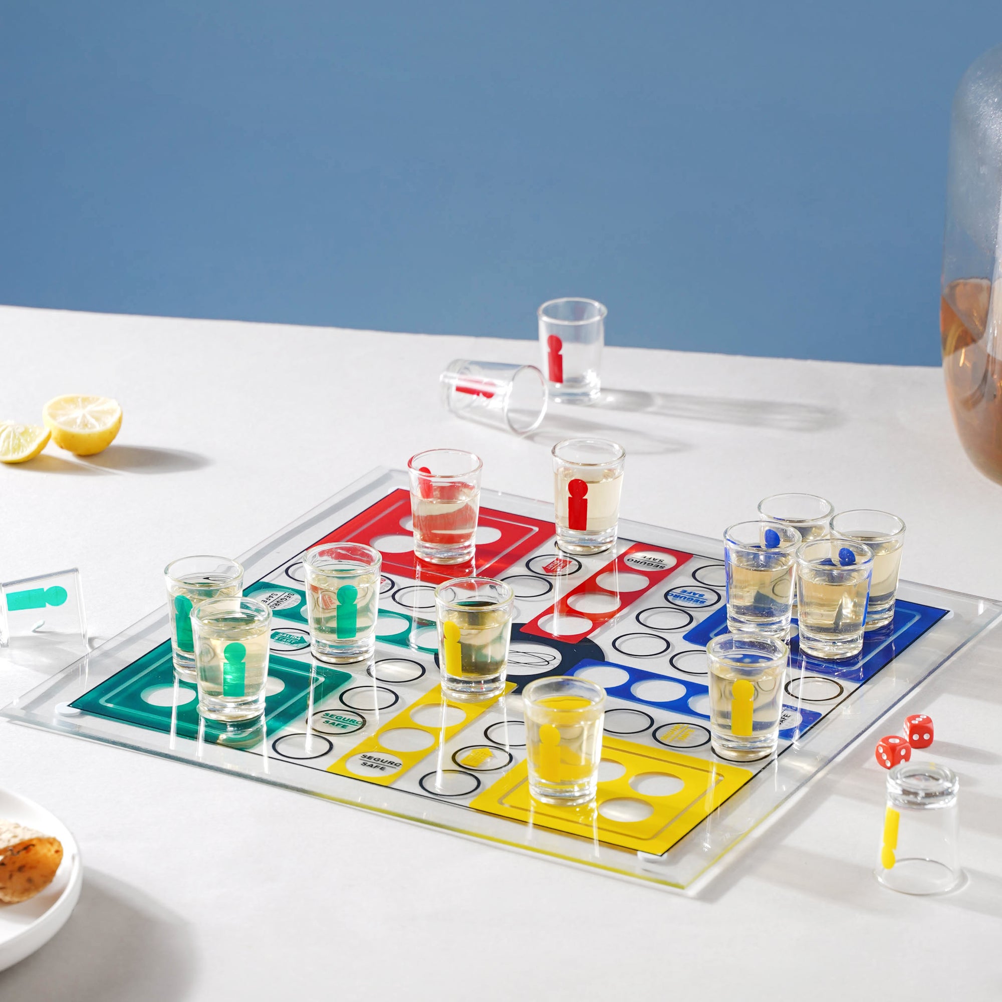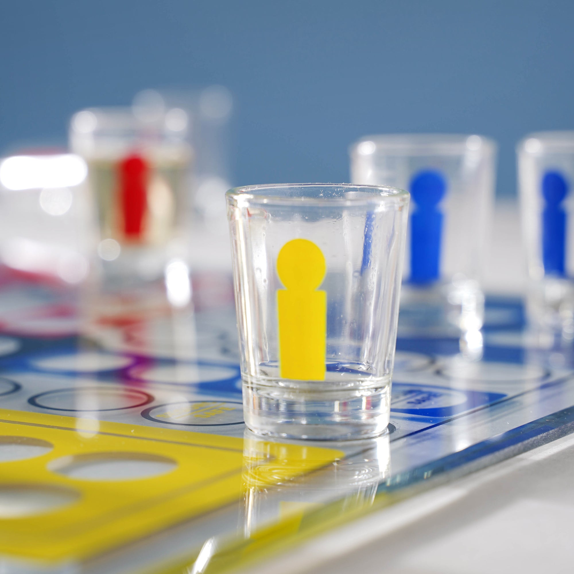 The childhood game of Ludo has been revamped to better suit your party needs. Roll the dice but don't move the tokens, as shot glasses are the ones to be shuffled around.