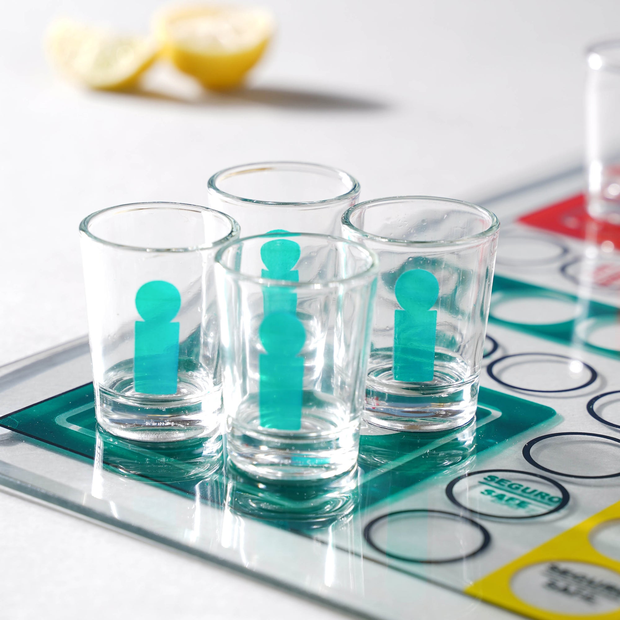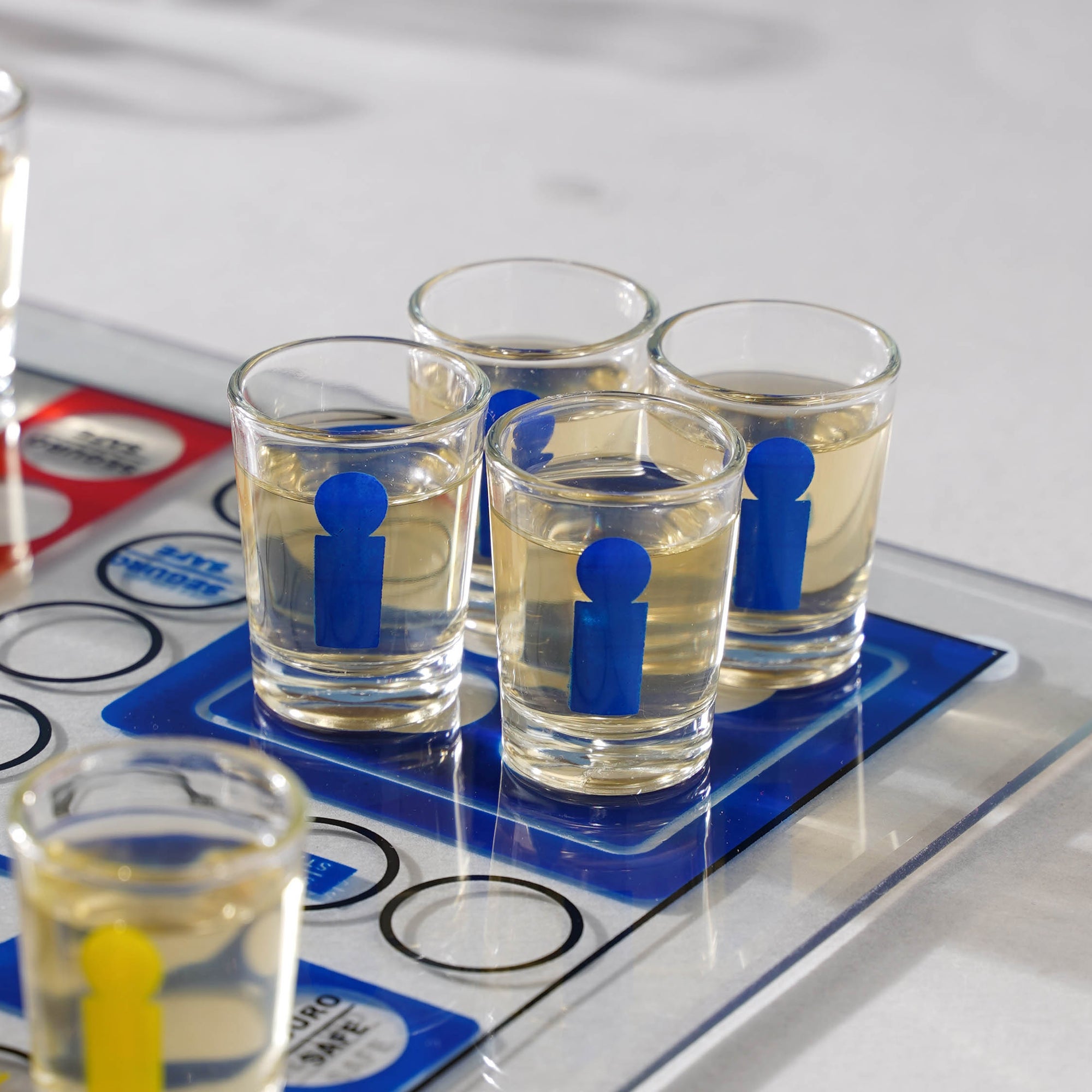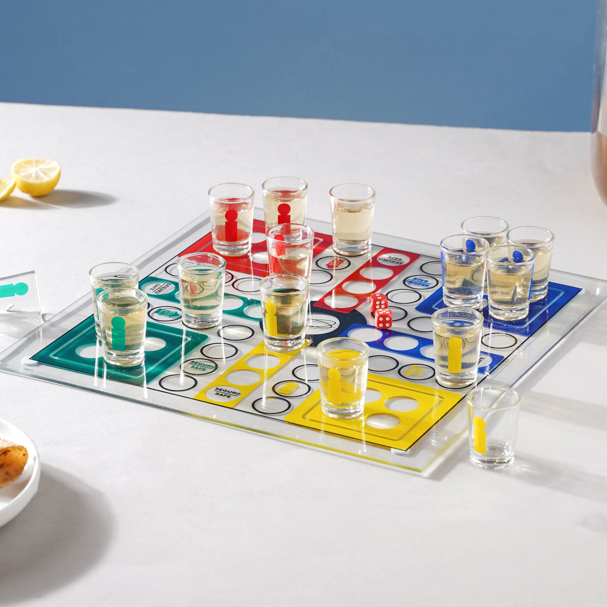 The childhood game of Ludo has been revamped to better suit your party needs. Roll the dice but don't move the tokens, as shot glasses are the ones to be shuffled around.