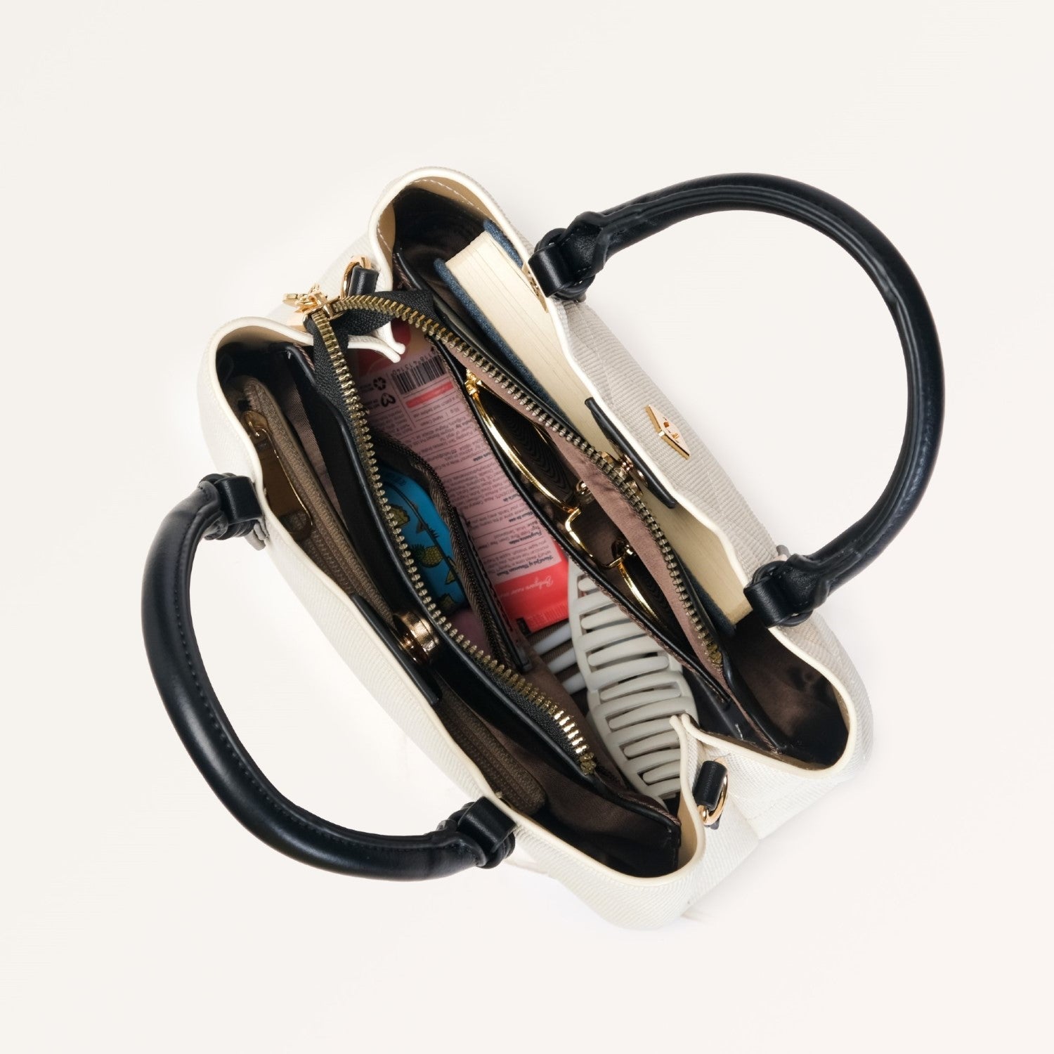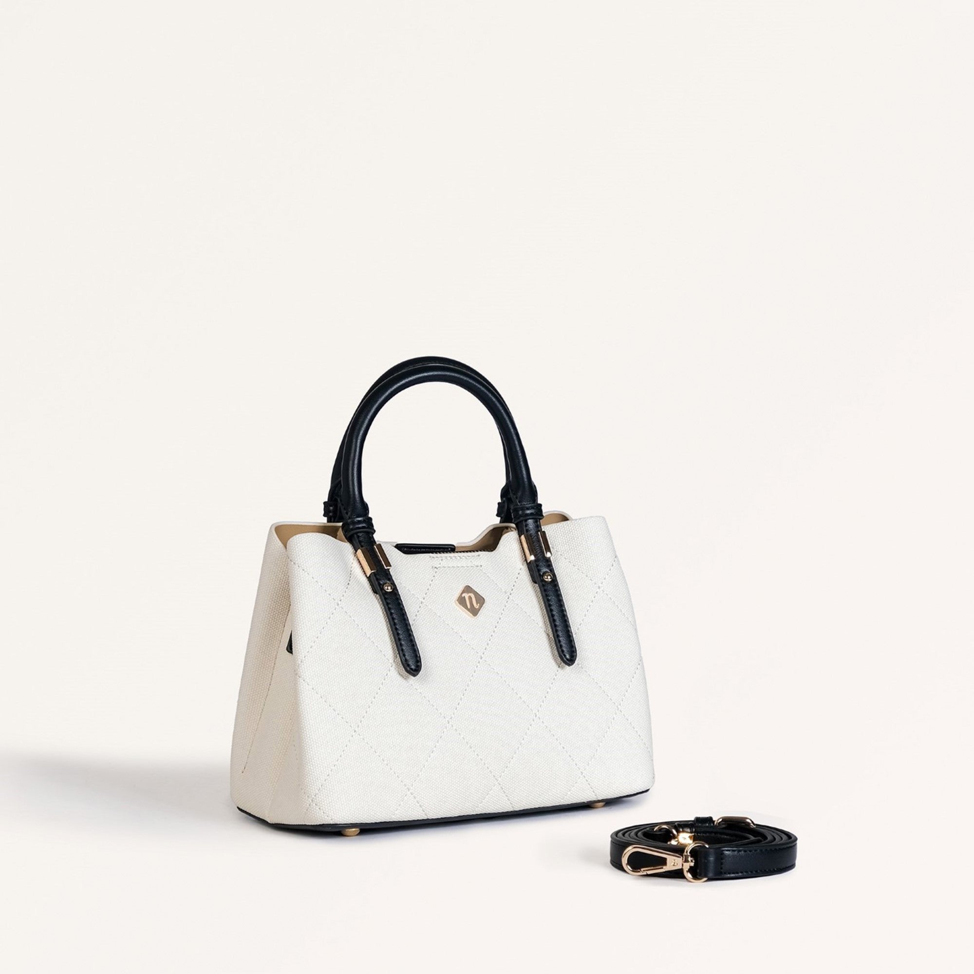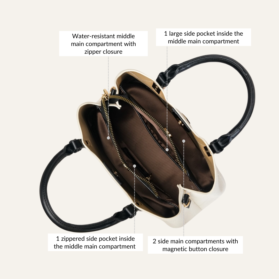 Design: Made from premium PU leather, the Luma satchel bag is the IT bag that completely elevates your accessory game. Featuring a crisp white body adorned with an elegant diamond-stitched pattern, this handbag exudes timeless charm. The sleek black handles and adjustable, detachable sling strap offer versatile carrying options, while the gold hardware detailing adds a luxurious touch. This mini satchel bag is designed with practicality in mind, boasting three main compartments to keep you organized. The water-resistant middle compartment, secured with a zipper, ensures your essentials stay protected, while the two side compartments, featuring magnetic button closures, provide easy access. Inside, you'll find a large pocket and a zippered pocket for added organization, making this mini handbag the perfect blend of style and functionality.