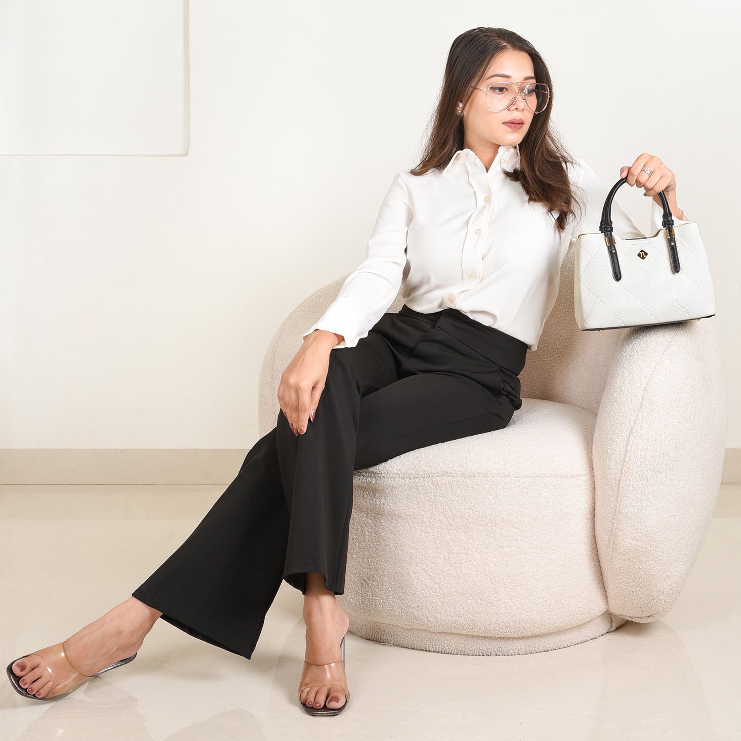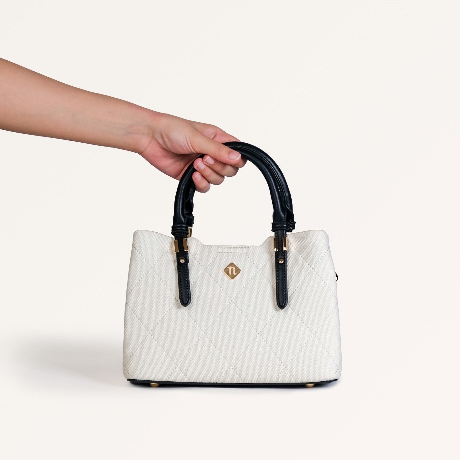 Inspiration: The Luma satchel bag draws its name from the concept of light and brilliance, encapsulating the essence of clarity and elegance. We wanted to create a handbag that mirrors the subtle beauty of light, combining classic design with modern functionality. Therefore, inspired by the pure, luminous quality of light, the bag’s white body symbolizes freshness and a new beginning, while the contrasting black handles represent strength and sophistication. The diamond-stitched pattern reflects the intricate play of light and shadow, creating a piece that is both striking and refined.