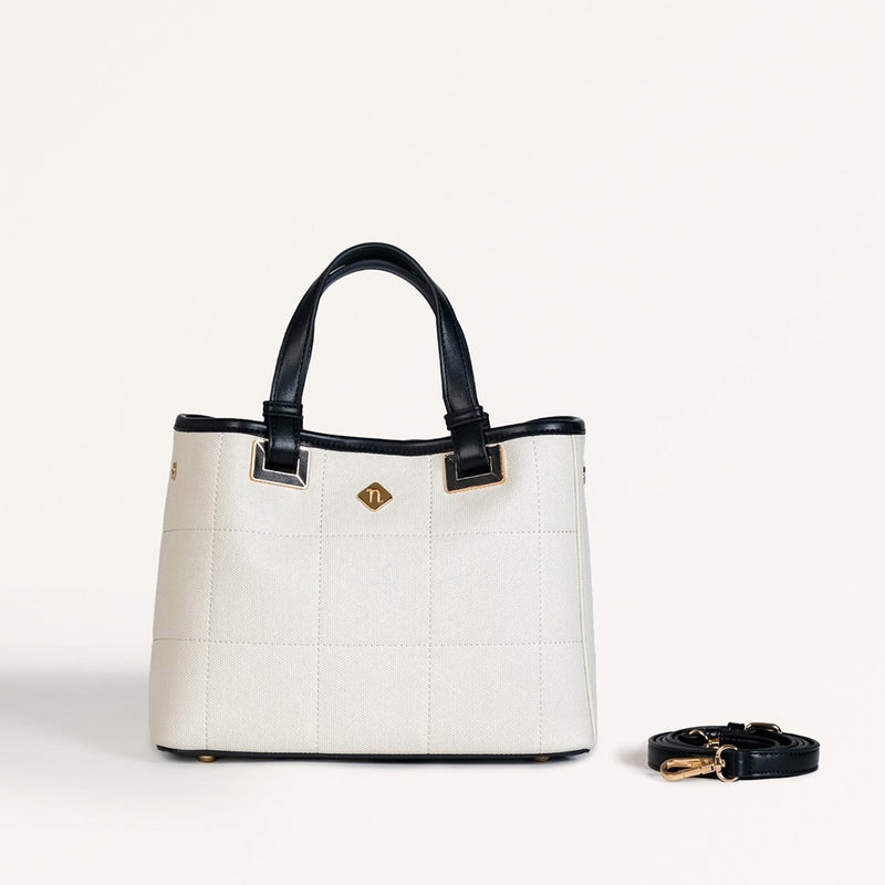 Design: Crafted from premium PU leather, the Luma satchel bag is a perfect blend of elegance and practicality. Its timeless checkered stitching on the soft white body exudes sophistication, beautifully complemented by sleek black handles and a matching adjustable, detachable sling strap. Gold hardware detailing adds a refined touch, while three spacious compartments make it as functional as it is fashionable. The water-resistant middle compartment, secured with a zipper, is ideal for protecting your essentials, while the two side compartments, equipped with magnetic button closures, offer quick access. Inside, you’ll discover a large side pocket and a zippered compartment for all your organizational needs.