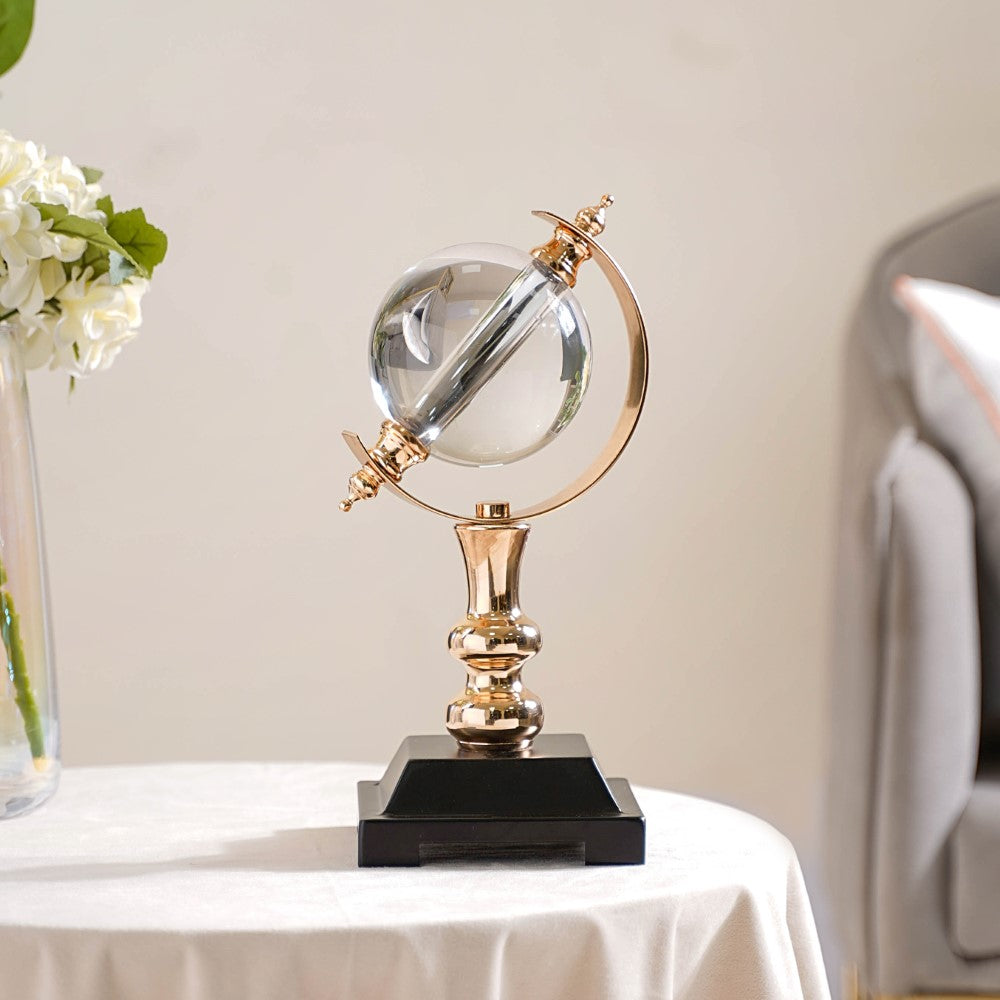 The crystal ball decor showpiece features a luminous and luxurious crystal glass ball at its front and centre with a golden metal frame and a black metal base. The glass crystal ball of the showpiece is tilted at an angle and supported by the lustrous golden metal frame and the metal base, accurately mirroring the design and style of a globe. The sturdy metal base also offers stability to prevent the showpiece from toppling off under the weight of the heavy crystal ball. Not to mention, the luminous glass crystal ball and the high-sheen metal finish of the decor showpiece reflect light to create a stunning visual effect while adding a shimmering touch to your room decor.