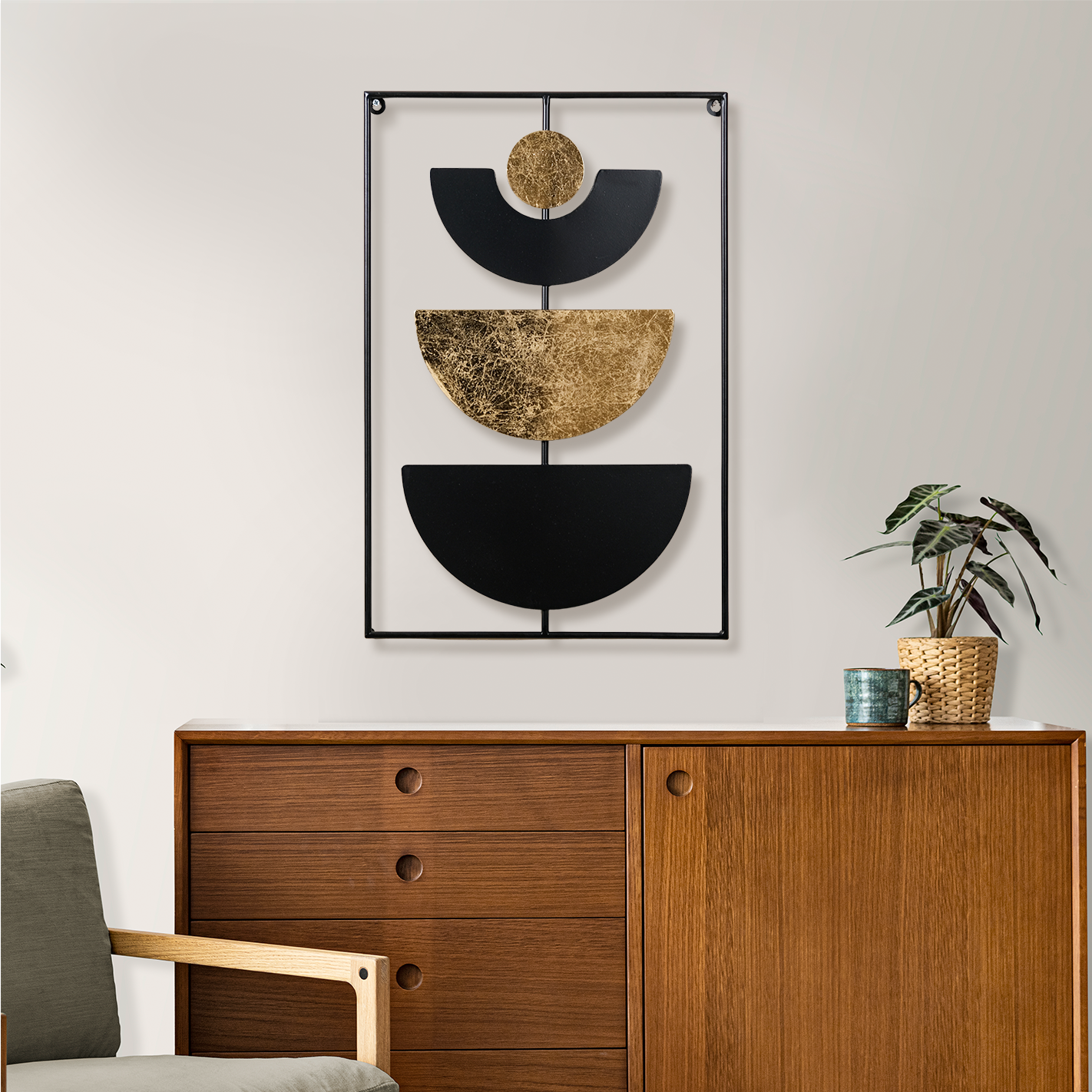 The framed metal wall art decor beautifully complements a variety of decor styles, thanks to its celestial elegance and contemporary abstraction. With its harmonious fusion of lunar cycle symbolism and expertly crafted metal design, it adds a touch of cosmic allure to any room.