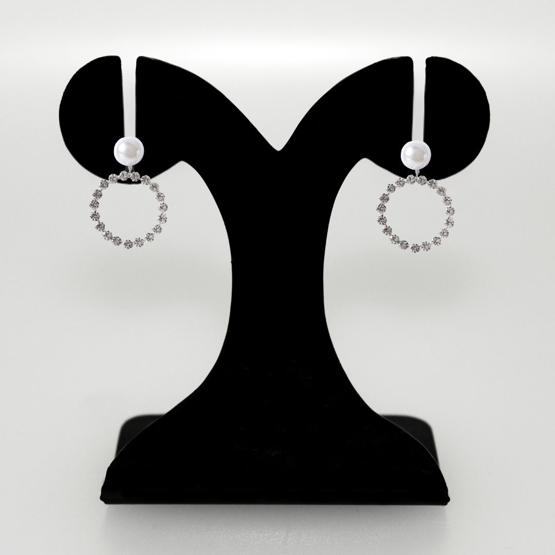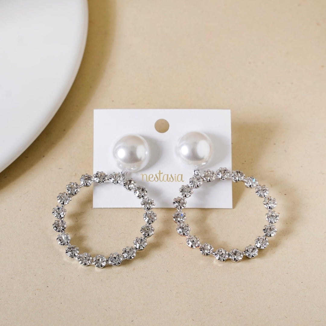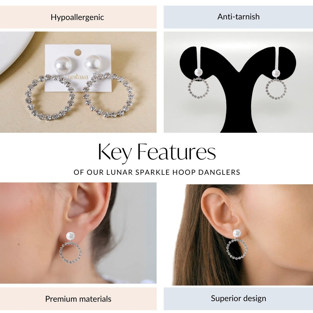 Inspired by the mystical allure of the moon, these danglers are a celestial celebration of elegance. A lustrous pearl, with its glossy iridescence, serves as the anchor, casting a soft, ethereal glow. Suspended below, a silver hoop takes shape like a crescent moon, encrusted with mesmerizing stones that shimmer with every movement, capturing the essence of starlit nights.
