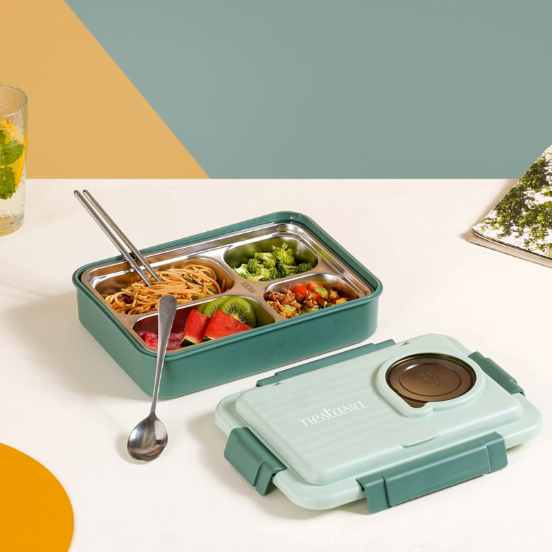 Introducing our premium lunch box, a must-have for any discerning food enthusiast looking for an exceptional lunchtime experience! It is made with high-quality materials to guarantee that your food is always delicious, safe, and fresh. This eco-friendly gem ensures non-toxic goodness because it is made of 304-grade stainless steel, which is food-safe and BPA-free. Your hot meals will stay excellent thanks to the warm water insulation, and your lunch will be easily secured with the airtight PVC top cover and clip locks. You can easily organise meals in the 4 different sections of the bento box. It is lightweight and highly durable. Upgrade your lunchtime bliss with our lunch box with compartments!