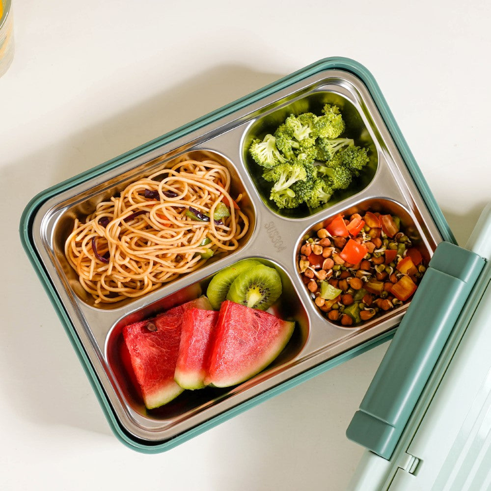 Introducing our premium lunch box, a must-have for any discerning food enthusiast looking for an exceptional lunchtime experience! It is made with high-quality materials to guarantee that your food is always delicious, safe, and fresh. This eco-friendly gem ensures non-toxic goodness because it is made of 304-grade stainless steel, which is food-safe and BPA-free. Your hot meals will stay excellent thanks to the warm water insulation, and your lunch will be easily secured with the airtight PVC top cover and clip locks. You can easily organise meals in the 4 different sections of the bento box. It is lightweight and highly durable. Upgrade your lunchtime bliss with our lunch box with compartments!
